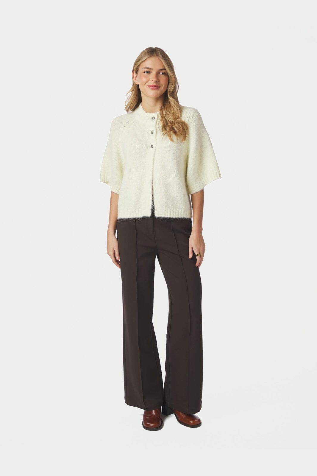 - Het model is 176 cm lang en draagt maat 36