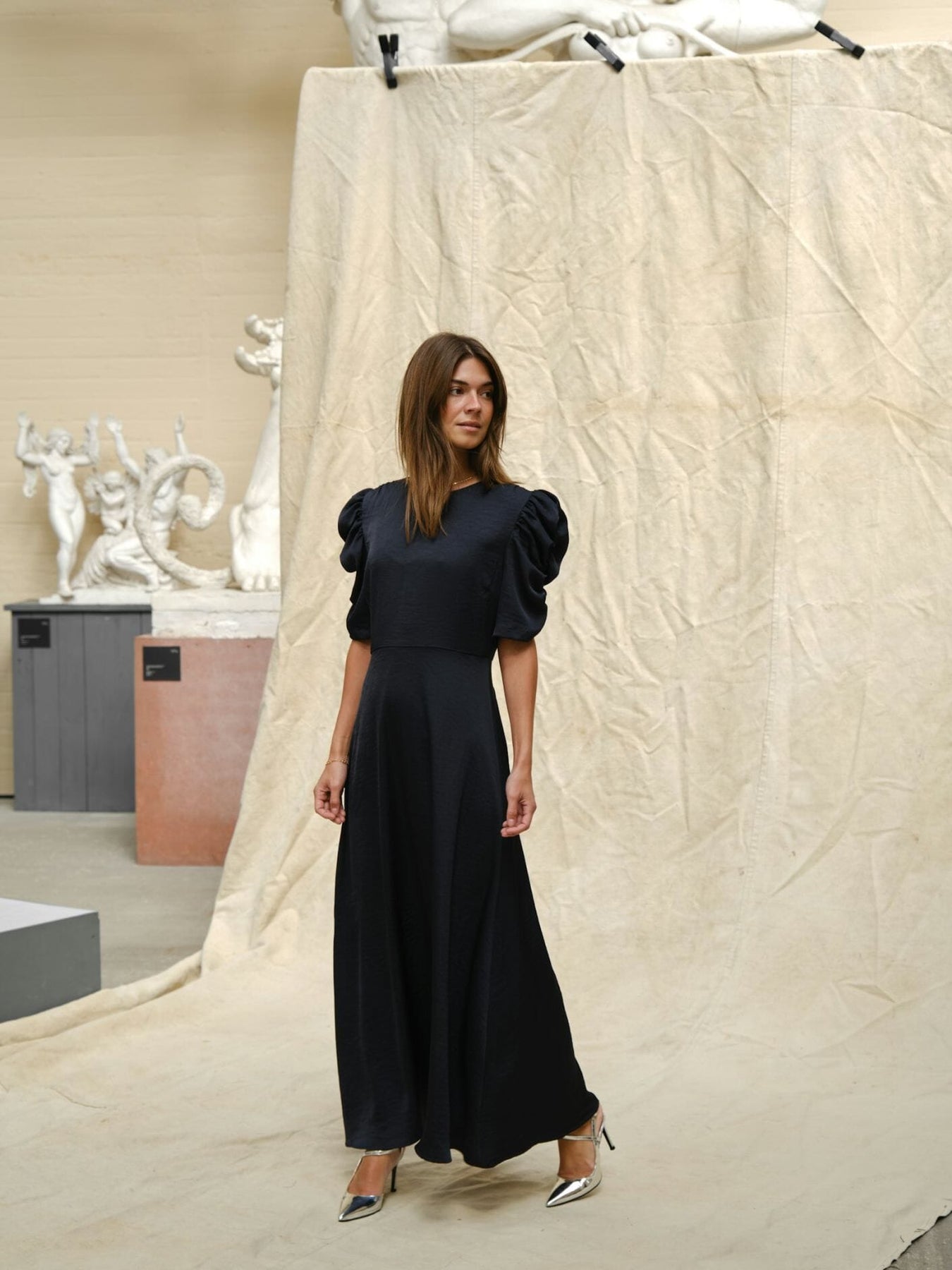 Elegant en vrouwelijke lange jurk. De jurk heeft korte mouwen met plooien en sluit met een rits in de nek. Het model is 176 cm en draagt maat 36.