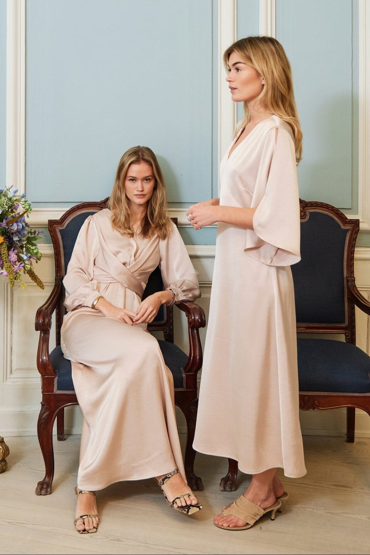Jurk van Neo Noir in een beige champagnekleur. De jurk heeft een overslagdesign met strikceintuur en een soepelvallende rok.