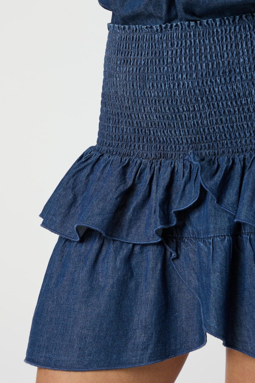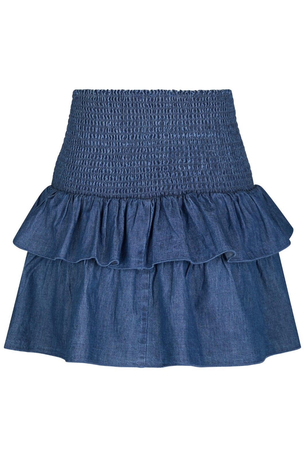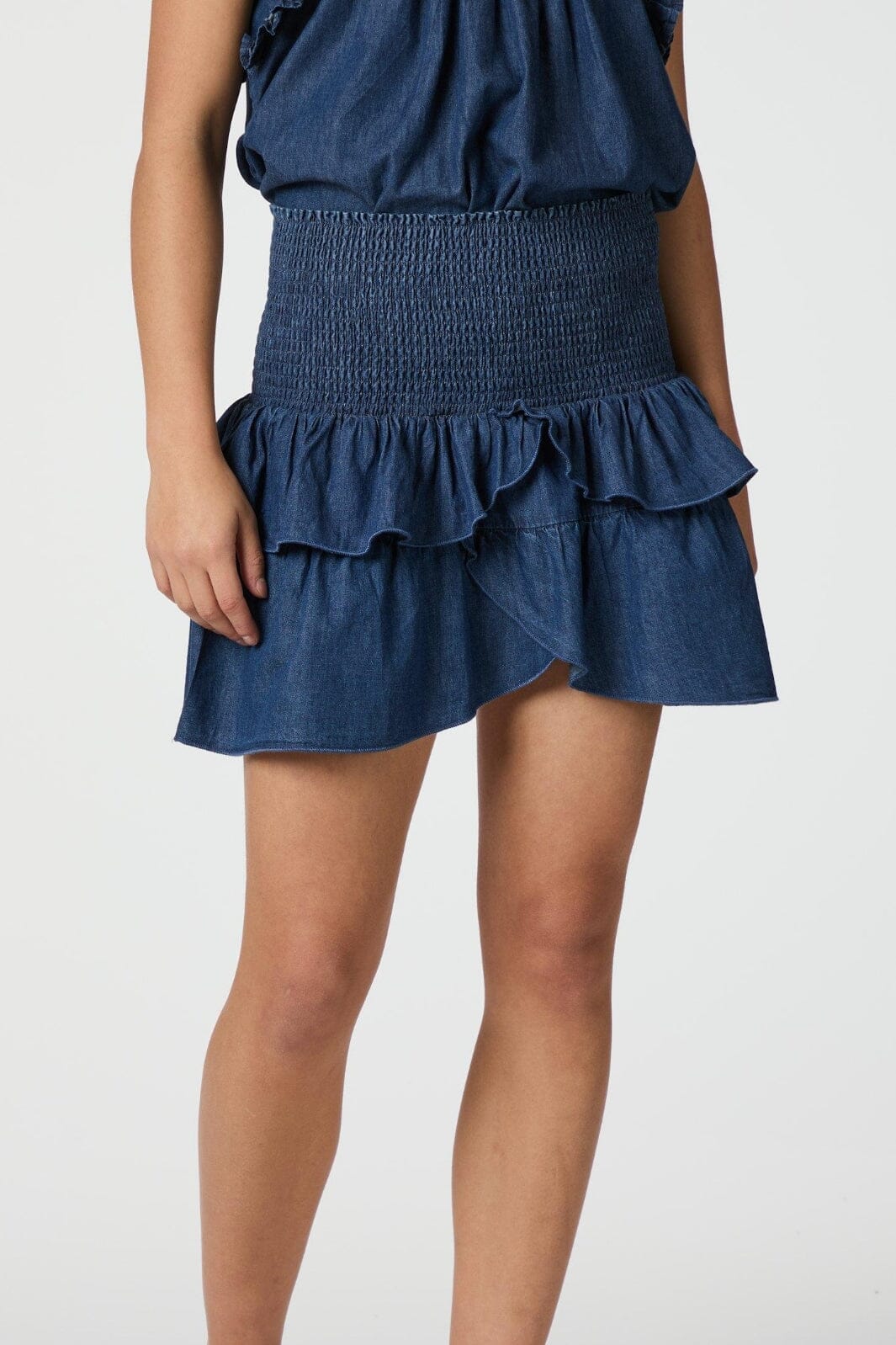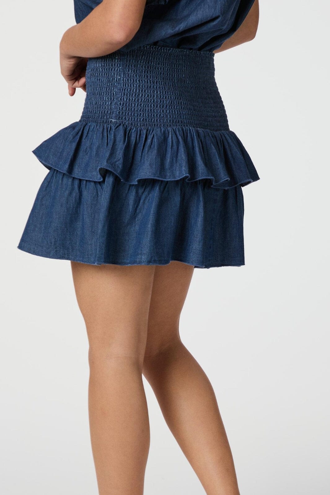 Blauwe denimrok van Neo Noir met twee lagen volants en een volantrand. De smock taille met elastiek zorgt voor een goede pasvorm, en de rok heeft een hoge taille.