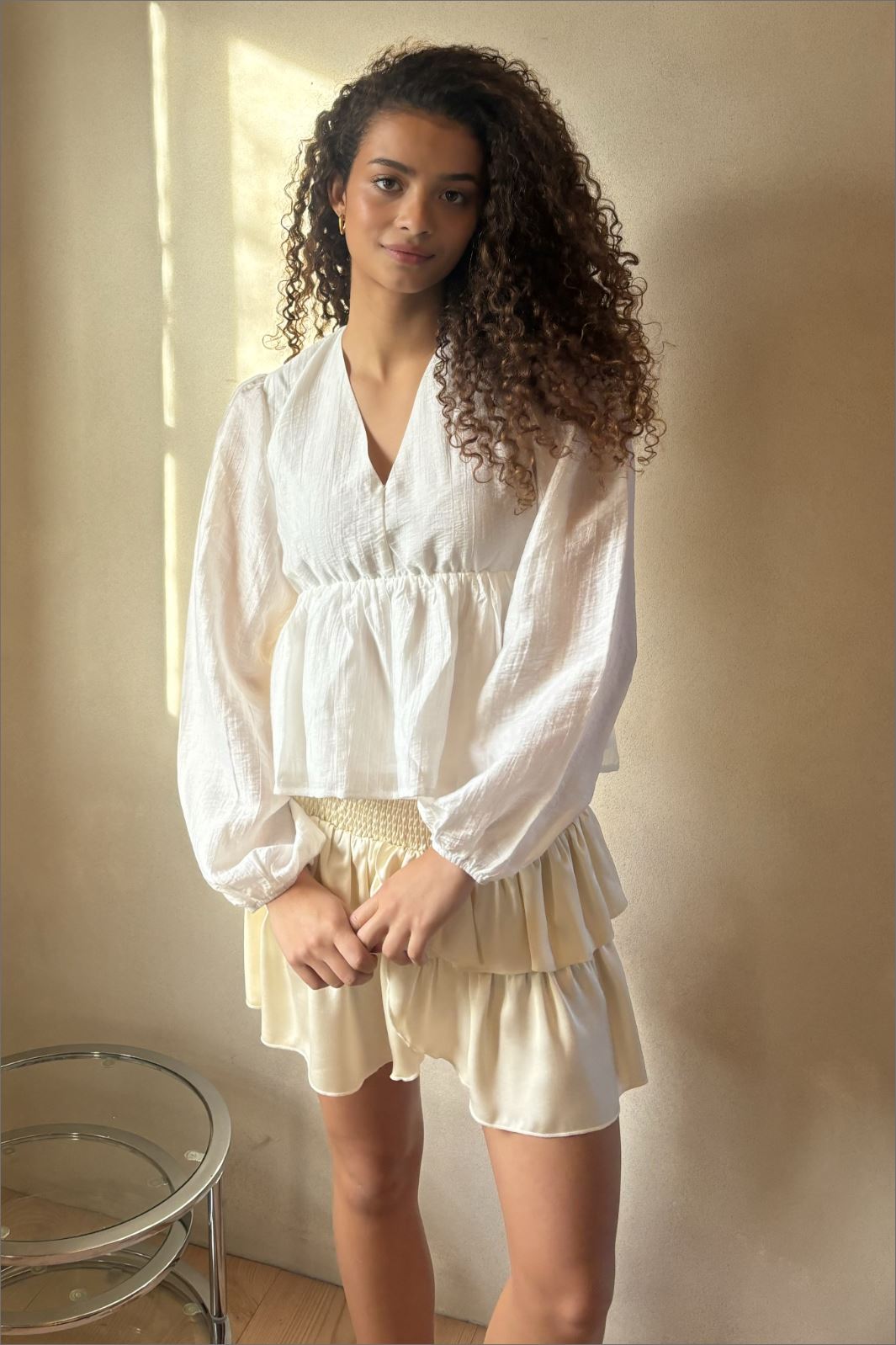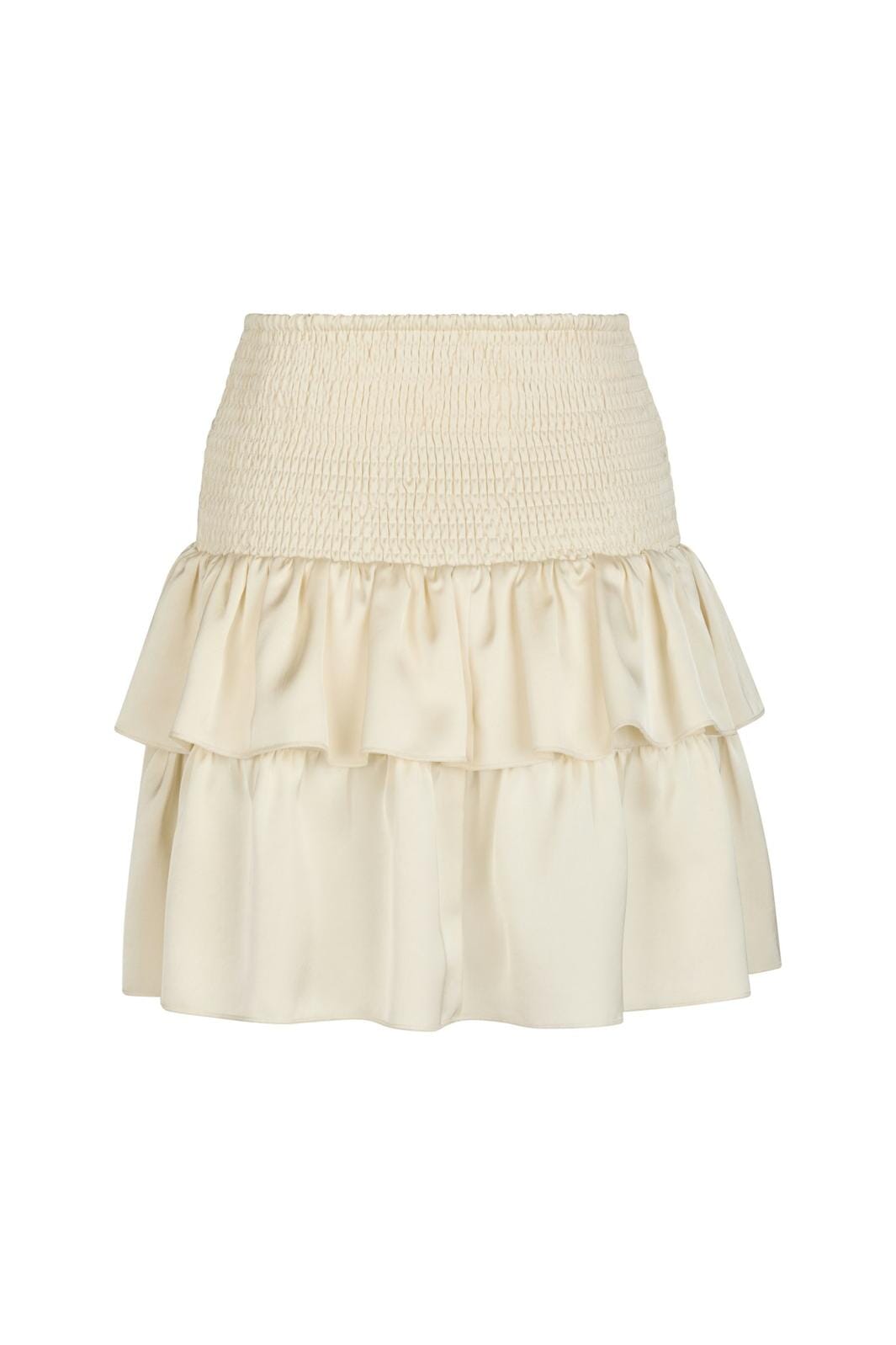 Korte rok van Neo Noir in parelgekleurde sateen. De rok heeft smock-elastiek in de taille en twee lagen volants die beweging aan het ontwerp geven.