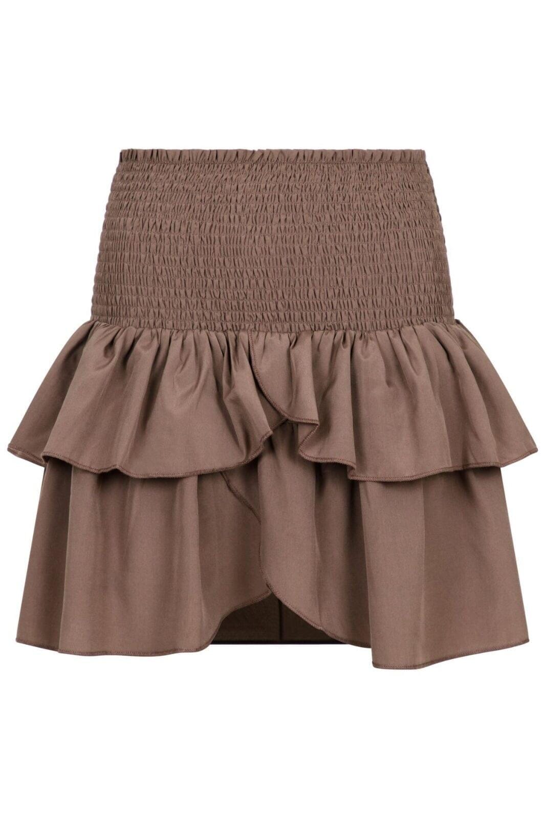 Stofbruine rok van Neo Noir met twee lagen volants en smock-tailleriem. De hoge taille en korte lengte geven de rok een dynamische uitstraling.