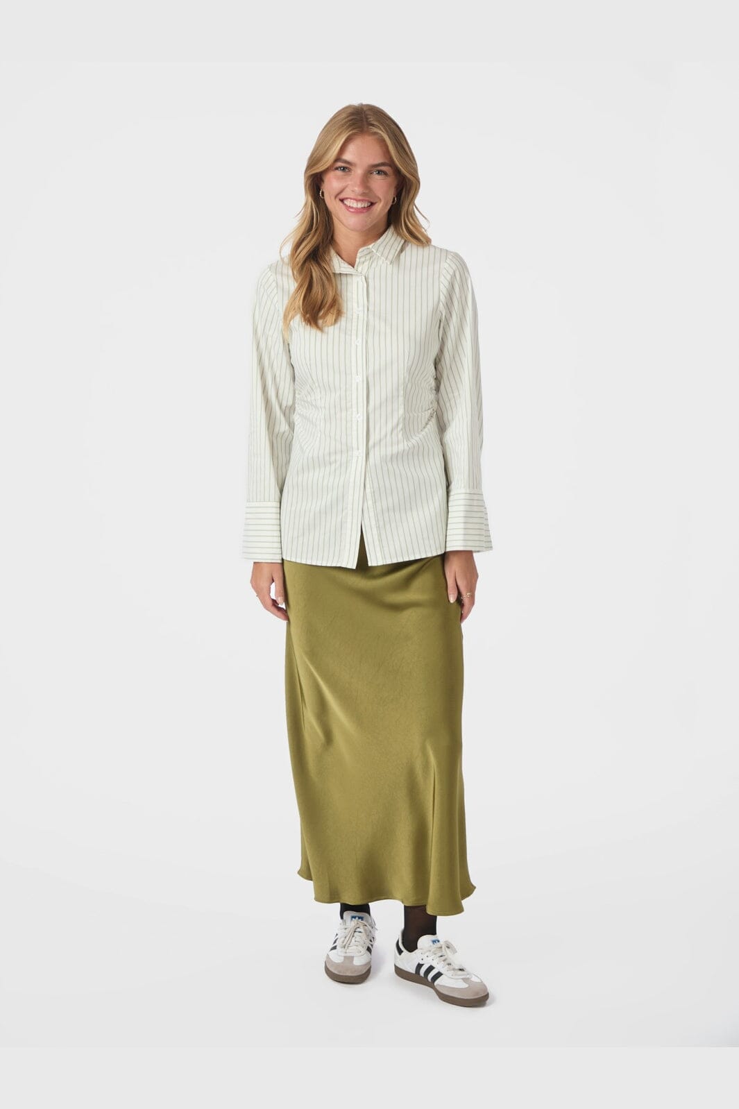 Gestreept shirt van Neo Noir in gedempt groen. Het shirt heeft verticale strepen in groen en crème op een witte basis.