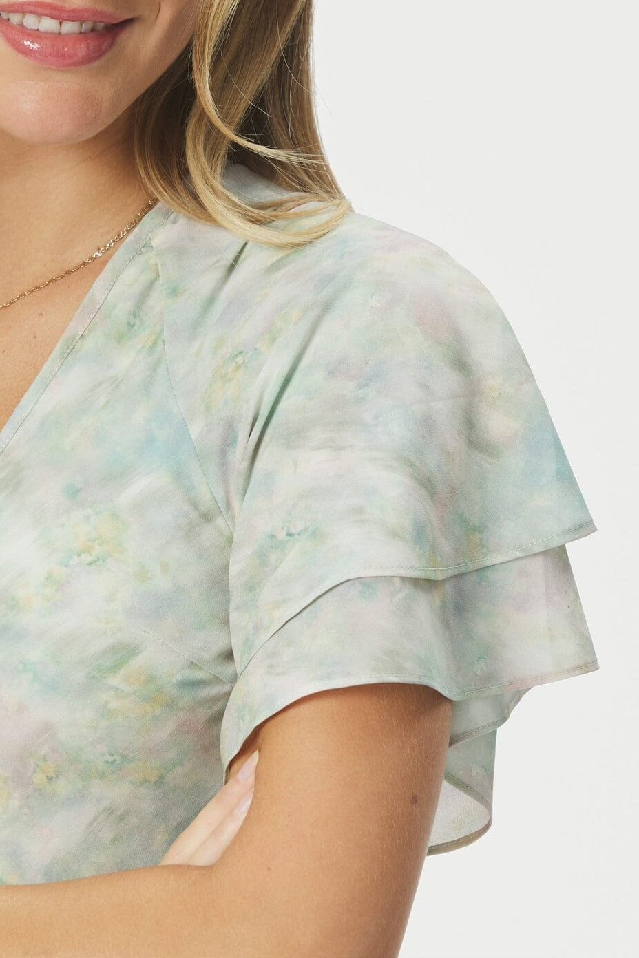 Chiffonjurk van Neo Noir in lichtgroen met een zachte aquarelprint. De jurk heeft korte, gelaagde mouwen en een V-hals.