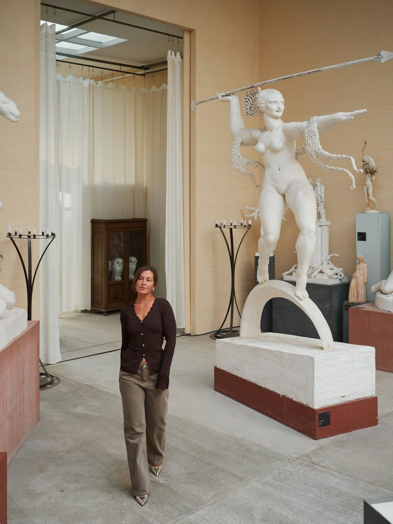 Donkerbruine gebreide trui van Neo Noir met een geribbelde textuur. De trui heeft een V-hals met een golvende rand en een aansluitende pasvorm die de lijnen van het lichaam volgt.