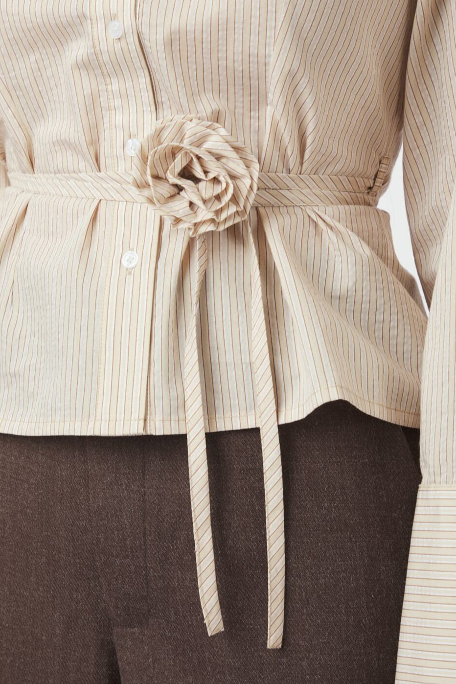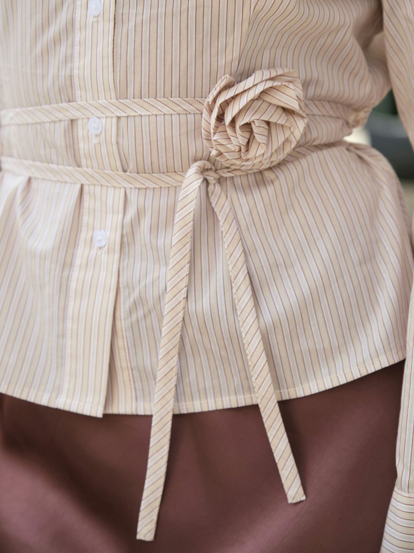Coole aansluitende blouse met brede mouwen en manchetten. De blouse wordt ook geleverd met een dunne riem met een roos om de pasvorm nog meer aansluitend te maken. Het model is 176 cm en draagt maat 36.