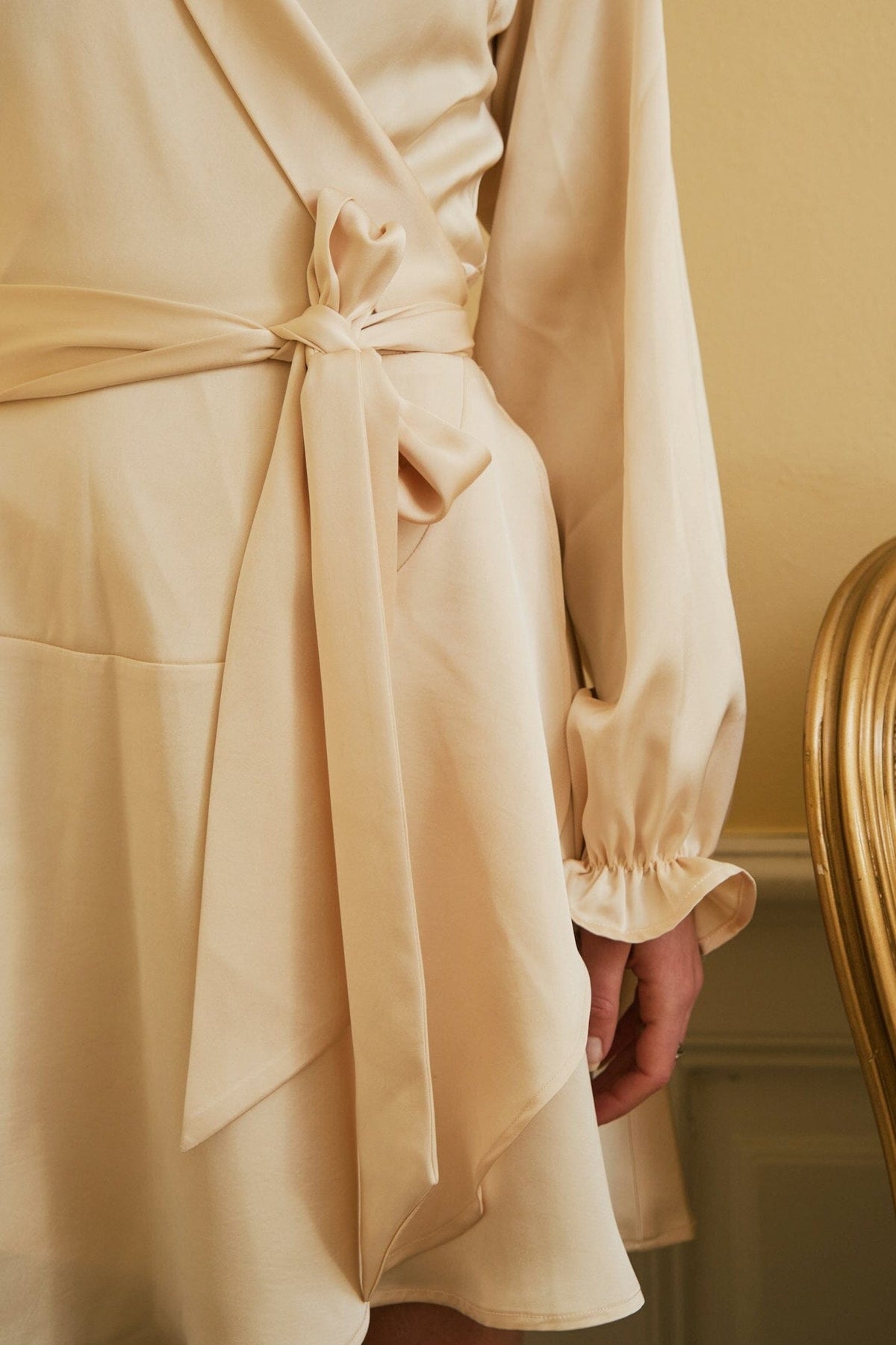 Korte jurk van Neo Noir, gemaakt van zware satijn in een lichtgele tint. De jurk heeft een V-hals, lange mouwen en een overslagdesign met strikceintuur.