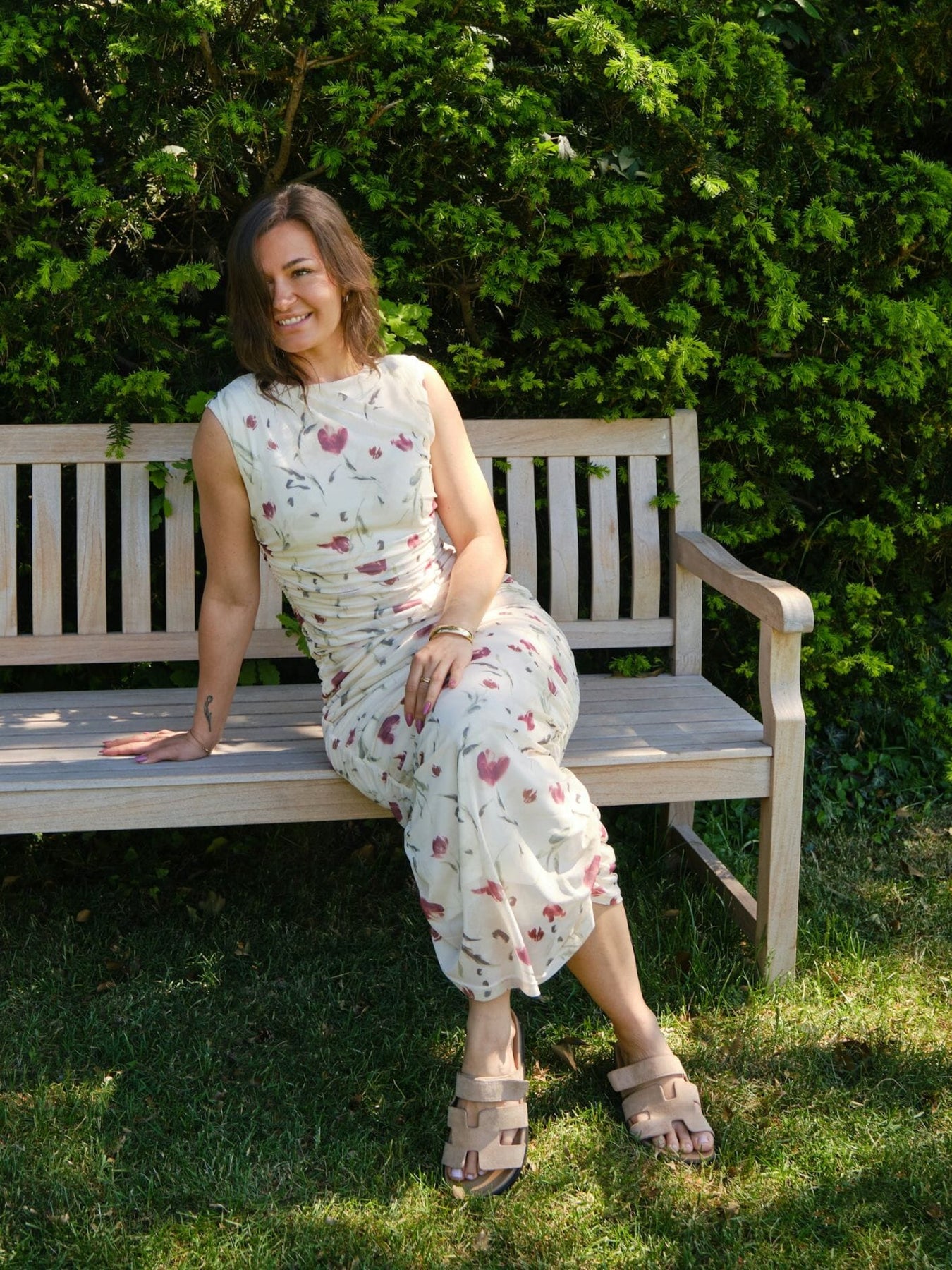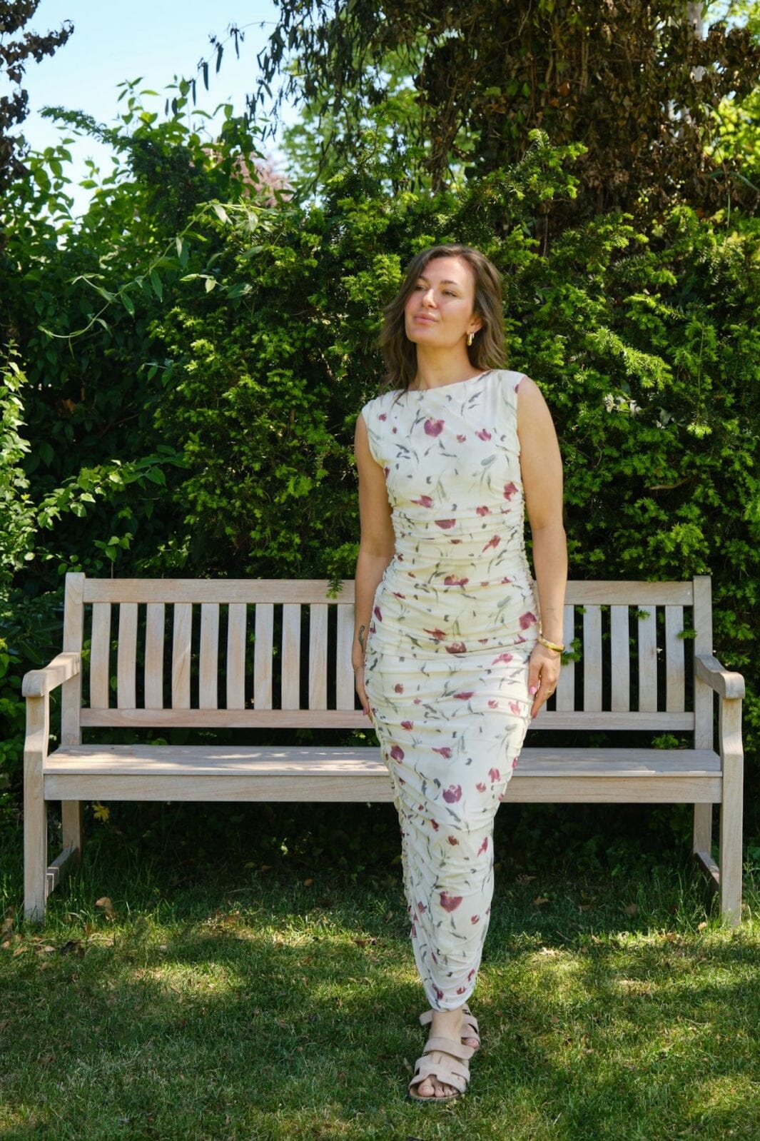 Crème-kleurige mesh jurk van Neo Noir met roze bloemenprint. De jurk heeft rimpeldetails langs de zijnaad en is gemaakt van een licht en luchtig materiaal met een ronde hals.