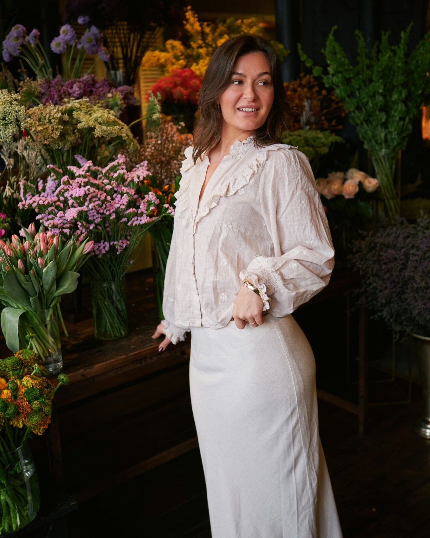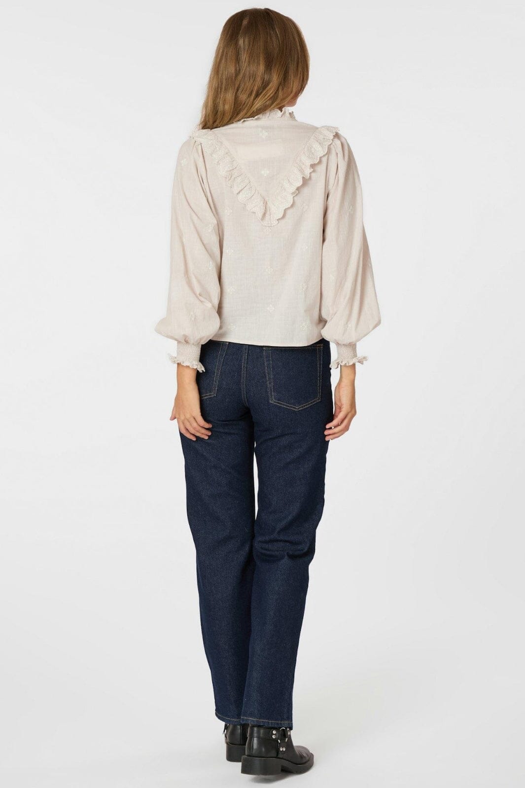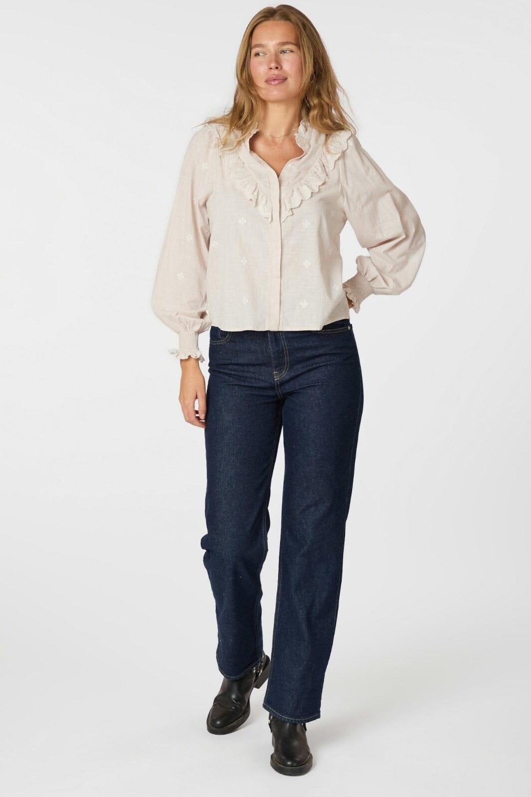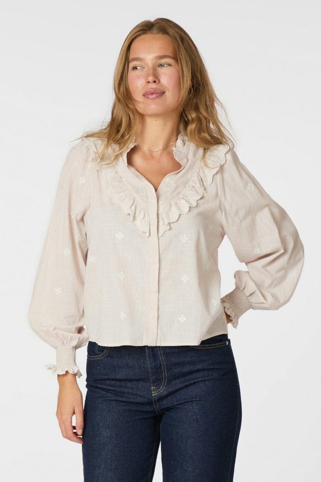 Crème-witte blouse van Neo Noir met geborduurd patroon. De blouse heeft een V-hals en lange mouwen met ruches en kant. De zachte katoenstof zorgt voor een comfortabele pasvorm.