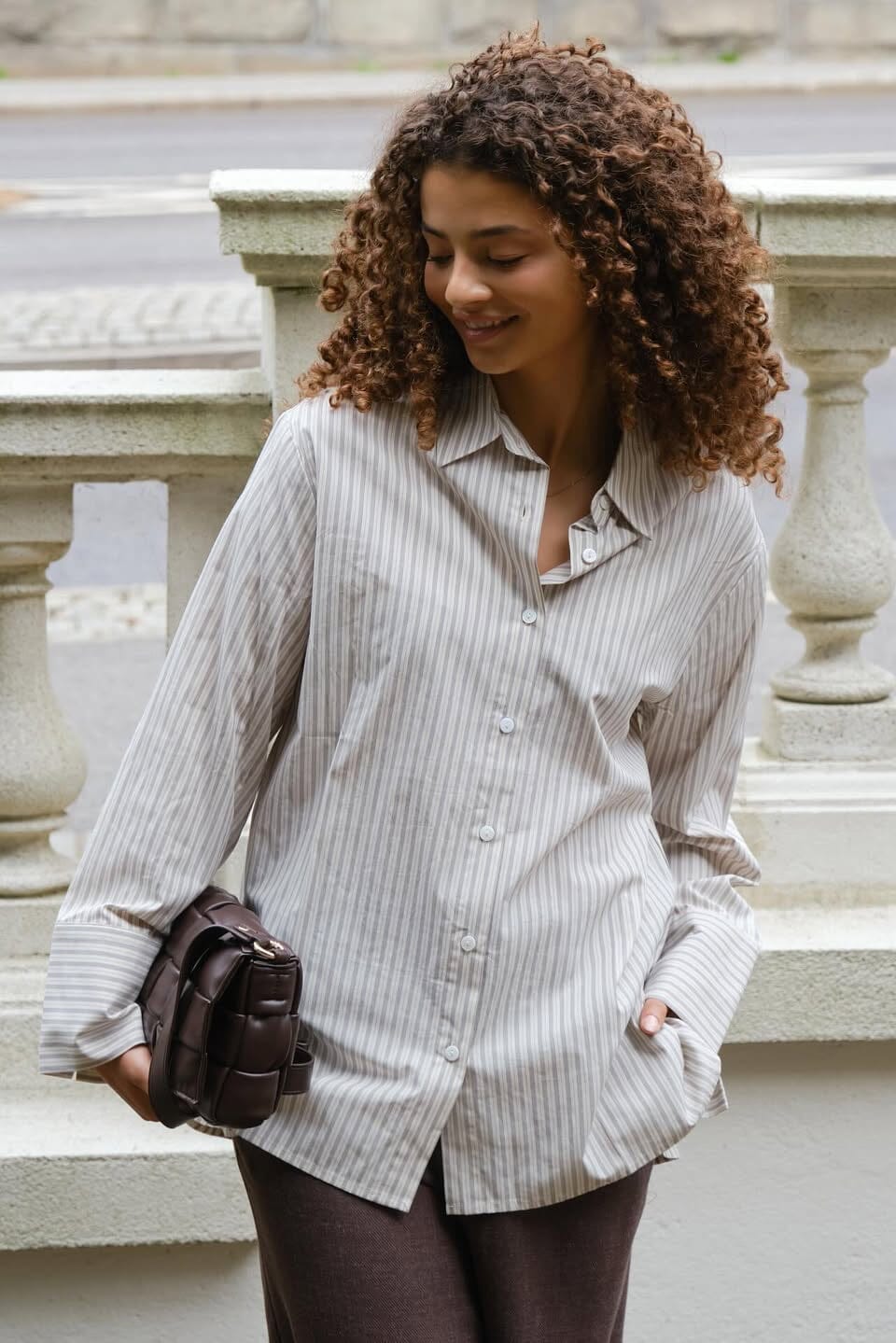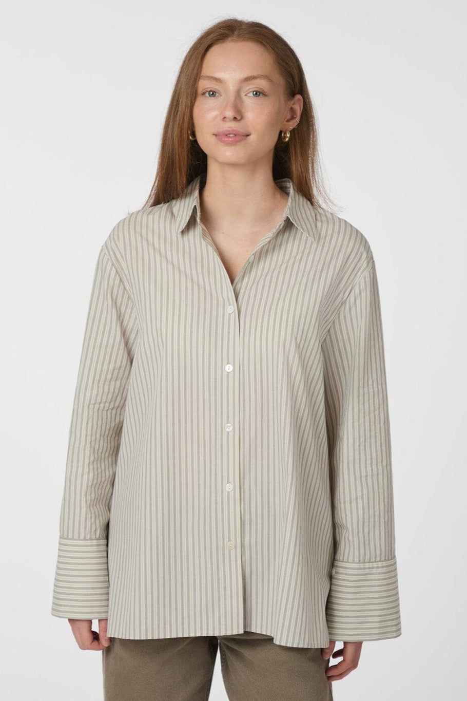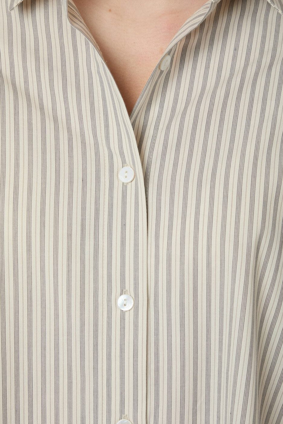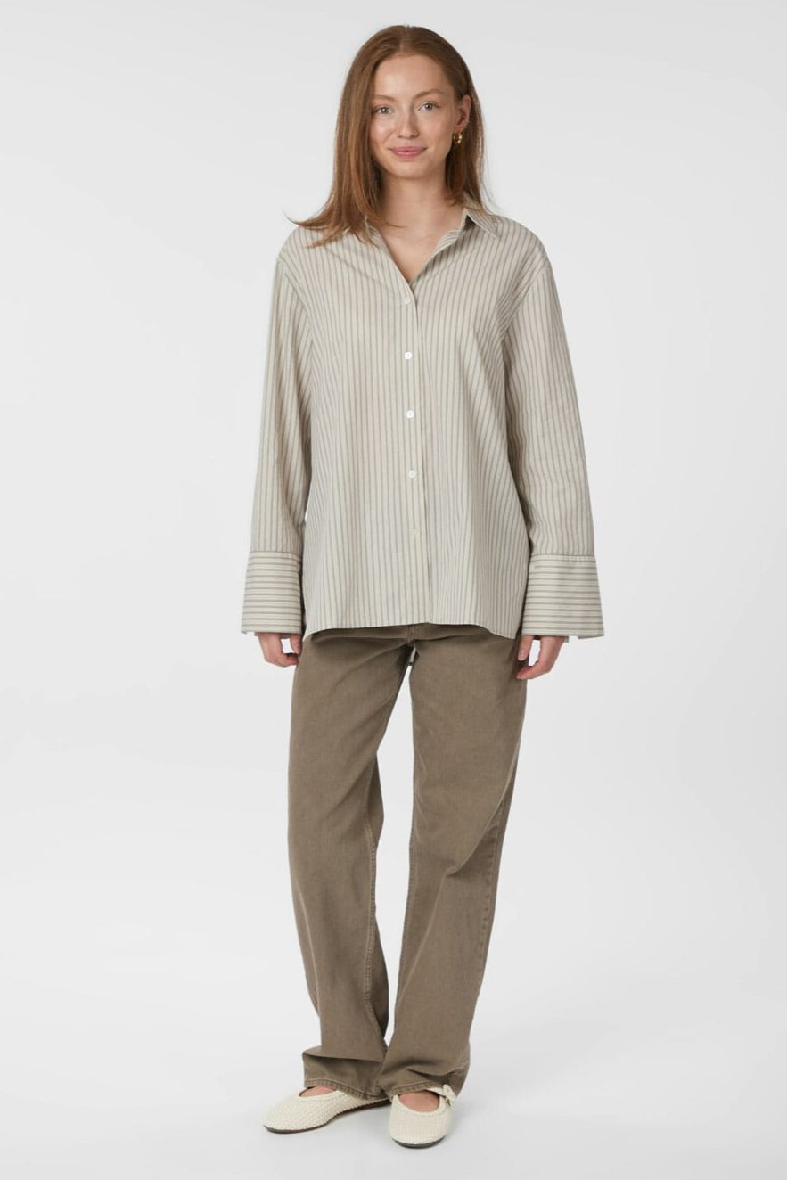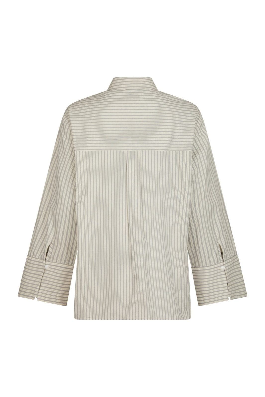 Een coole oversized blouse in heerlijk gestreepte katoenkwaliteit. Het model is 176 cm en draagt maat 36.