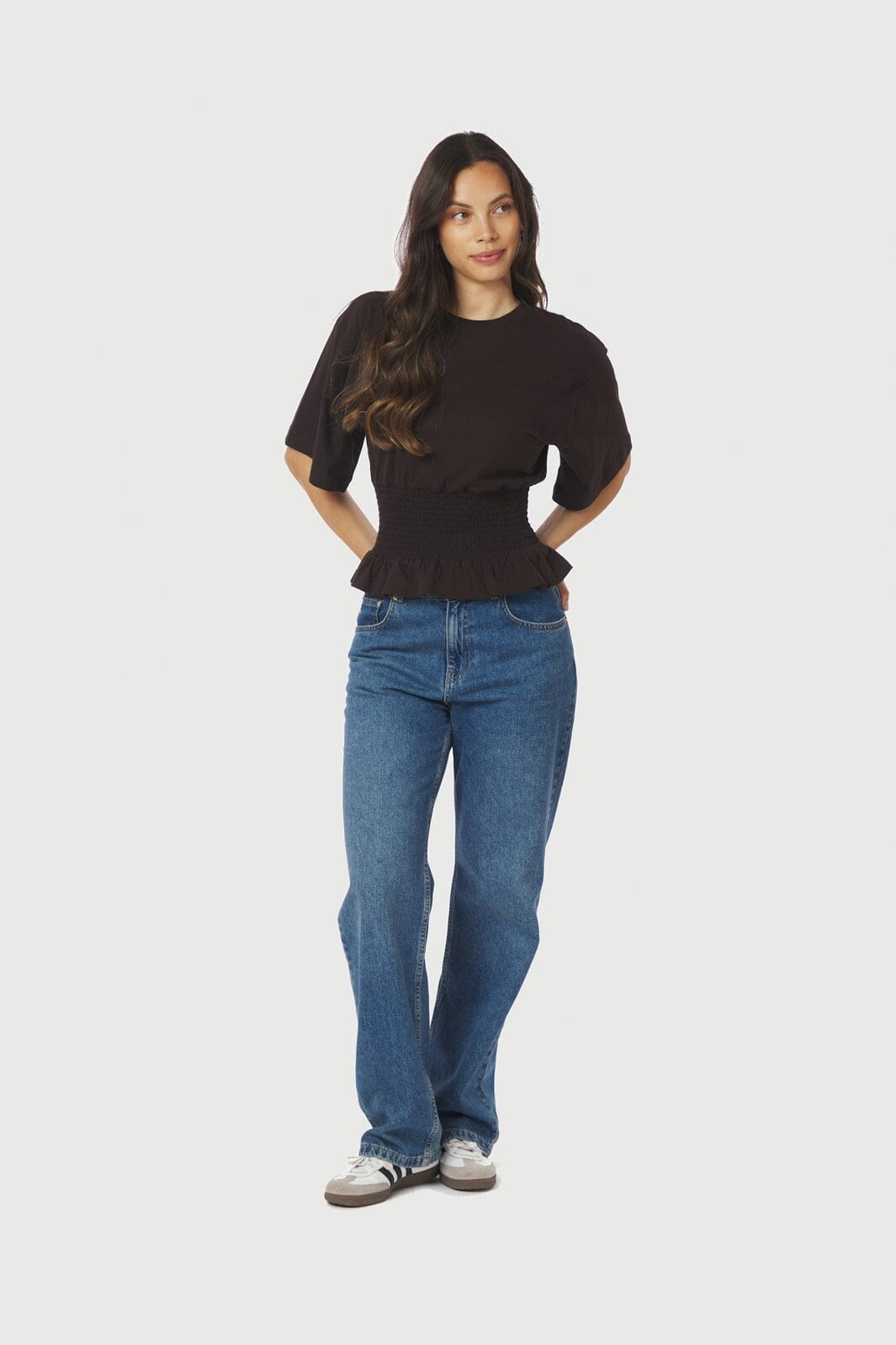 Donkerbruine t-shirt van Neo Noir met een boxy pasvorm en smock-detail in de taille. De ronde halslijn en de korte mouwen geven de t-shirt een strakke en eenvoudige uitstraling.