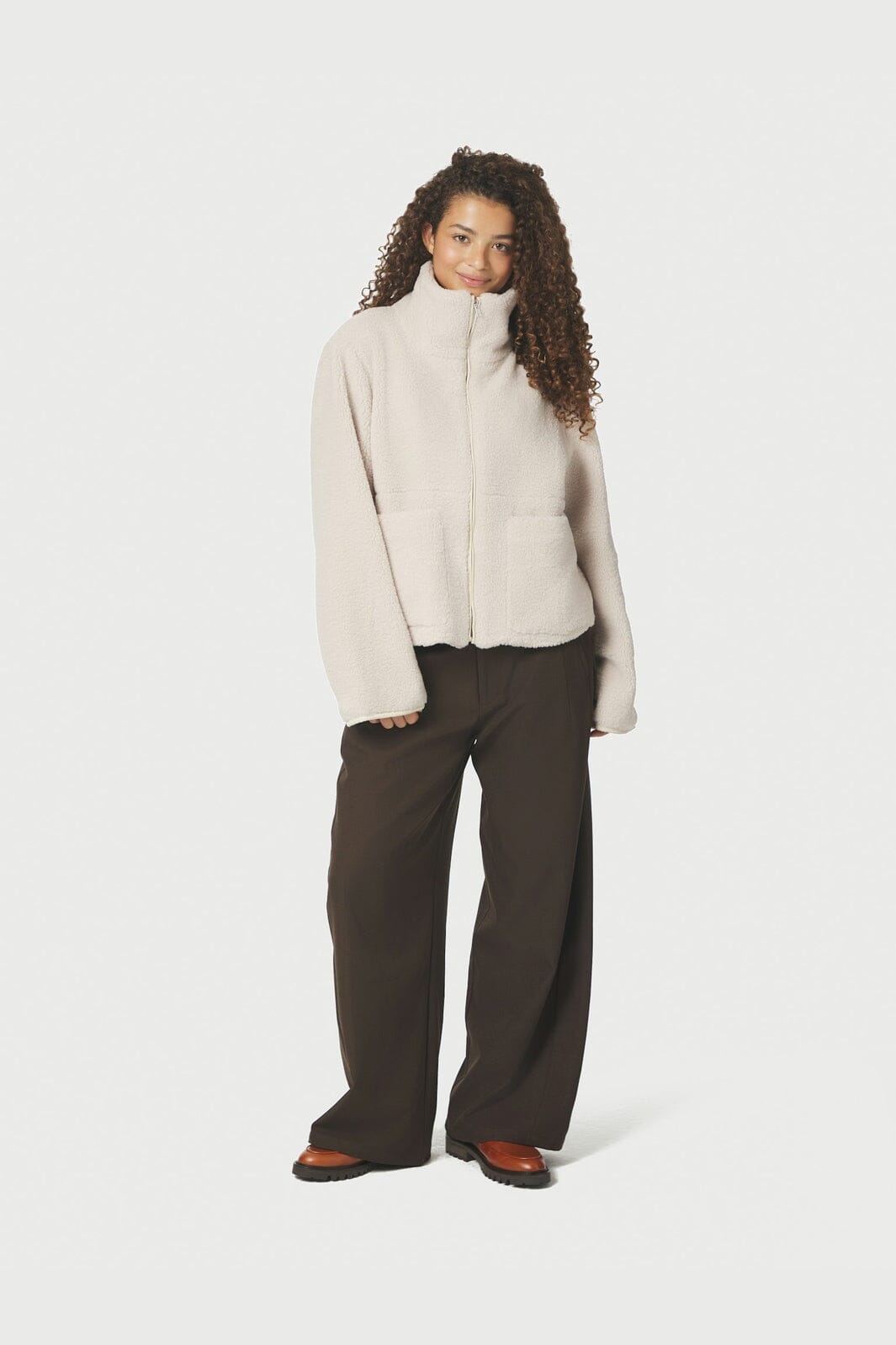 Teddyjas van Neo Noir in een zachte ivoorkleurige tint. De jas heeft een hoge kraag en een losse pasvorm die zowel thuis als in het dagelijks leven geschikt is.