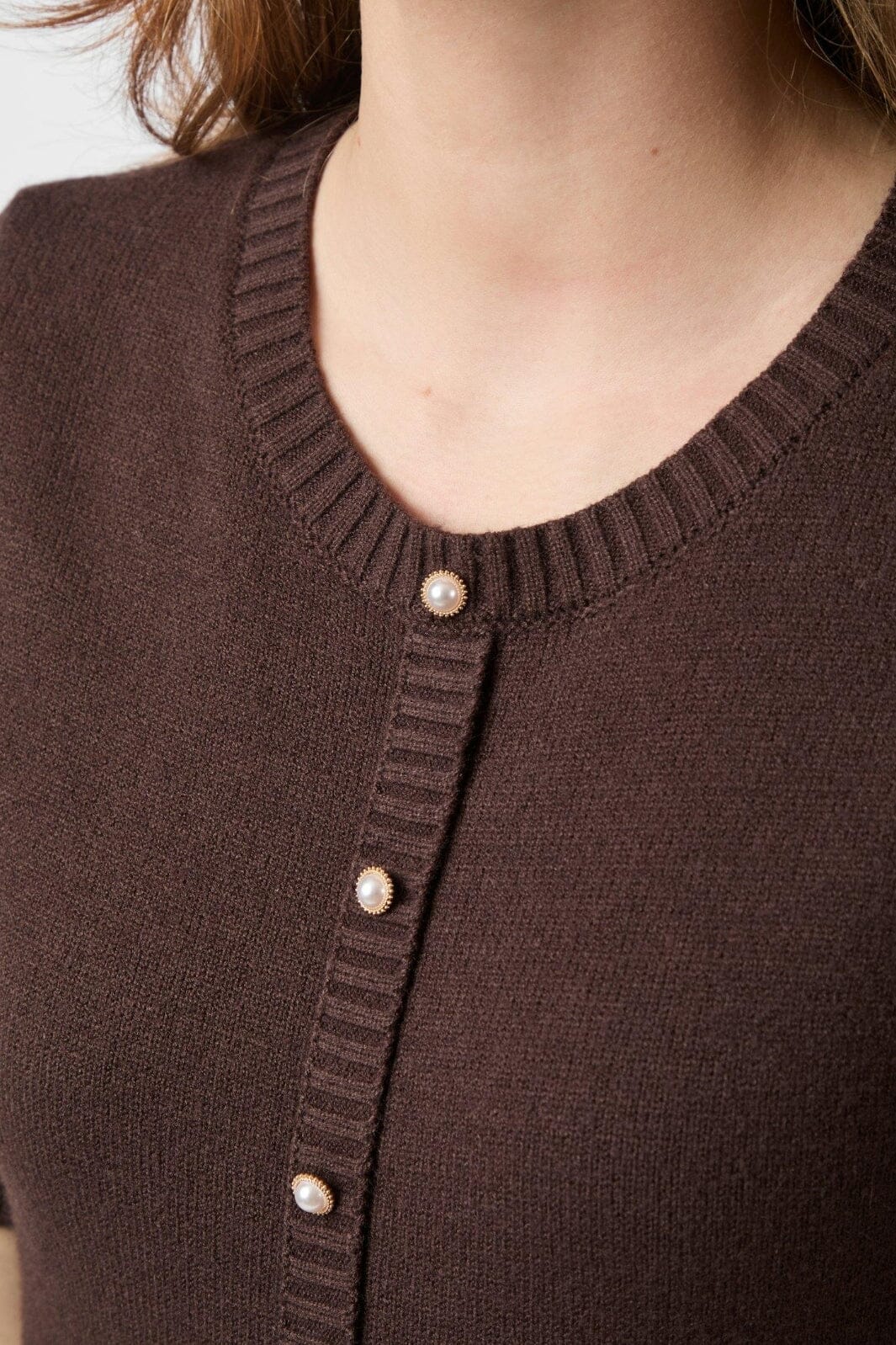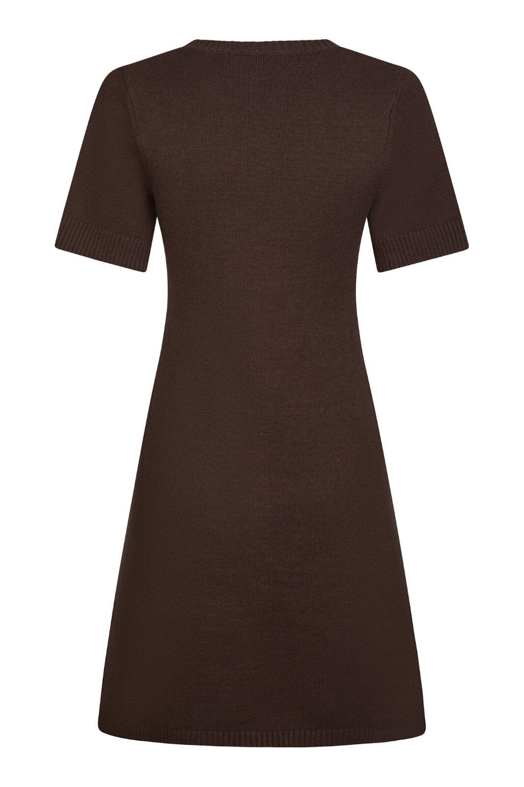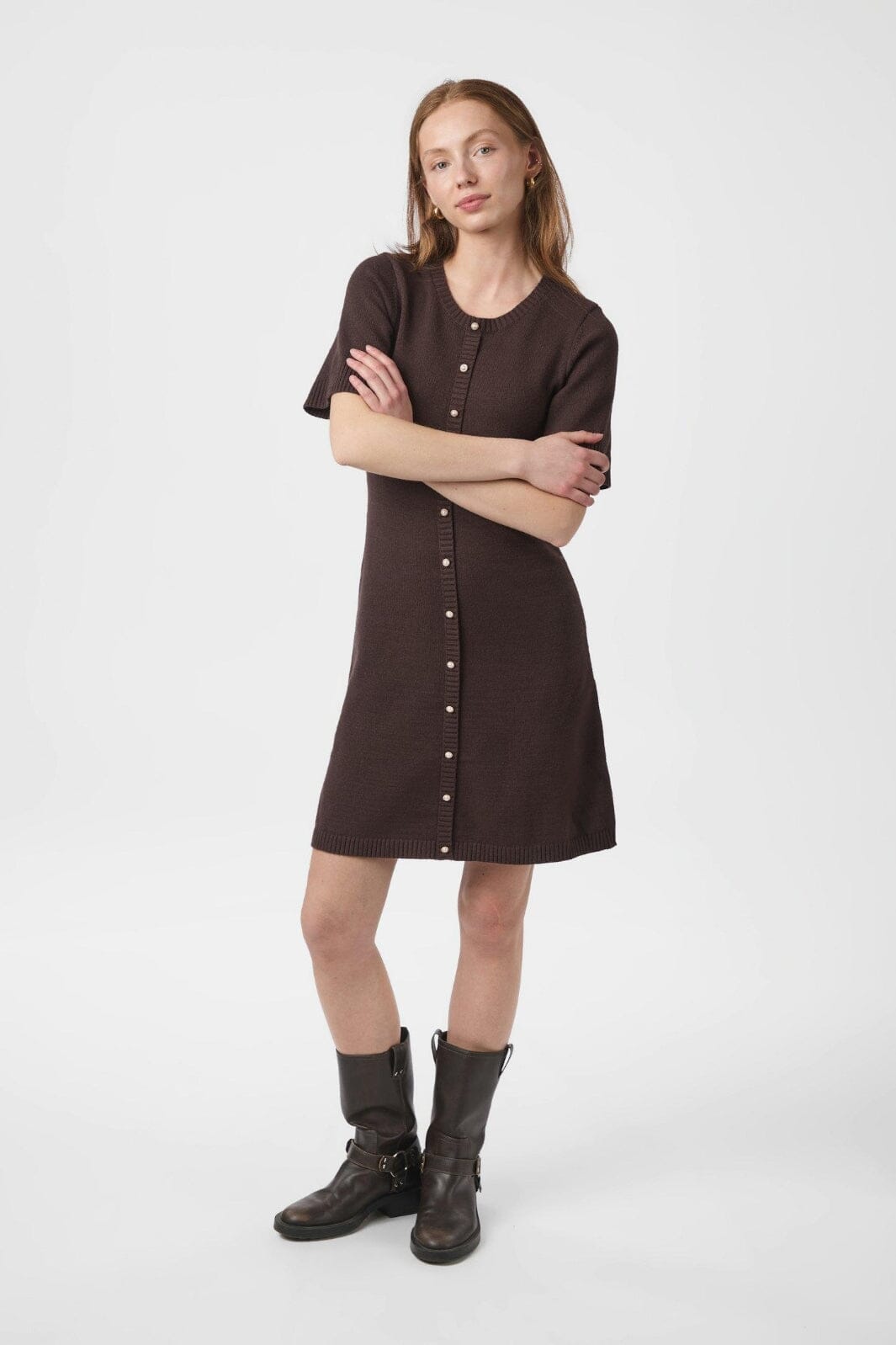 Zoete korte gebreide jurk met knoopsluiting aan de voorkant. Het model draagt maat 36.