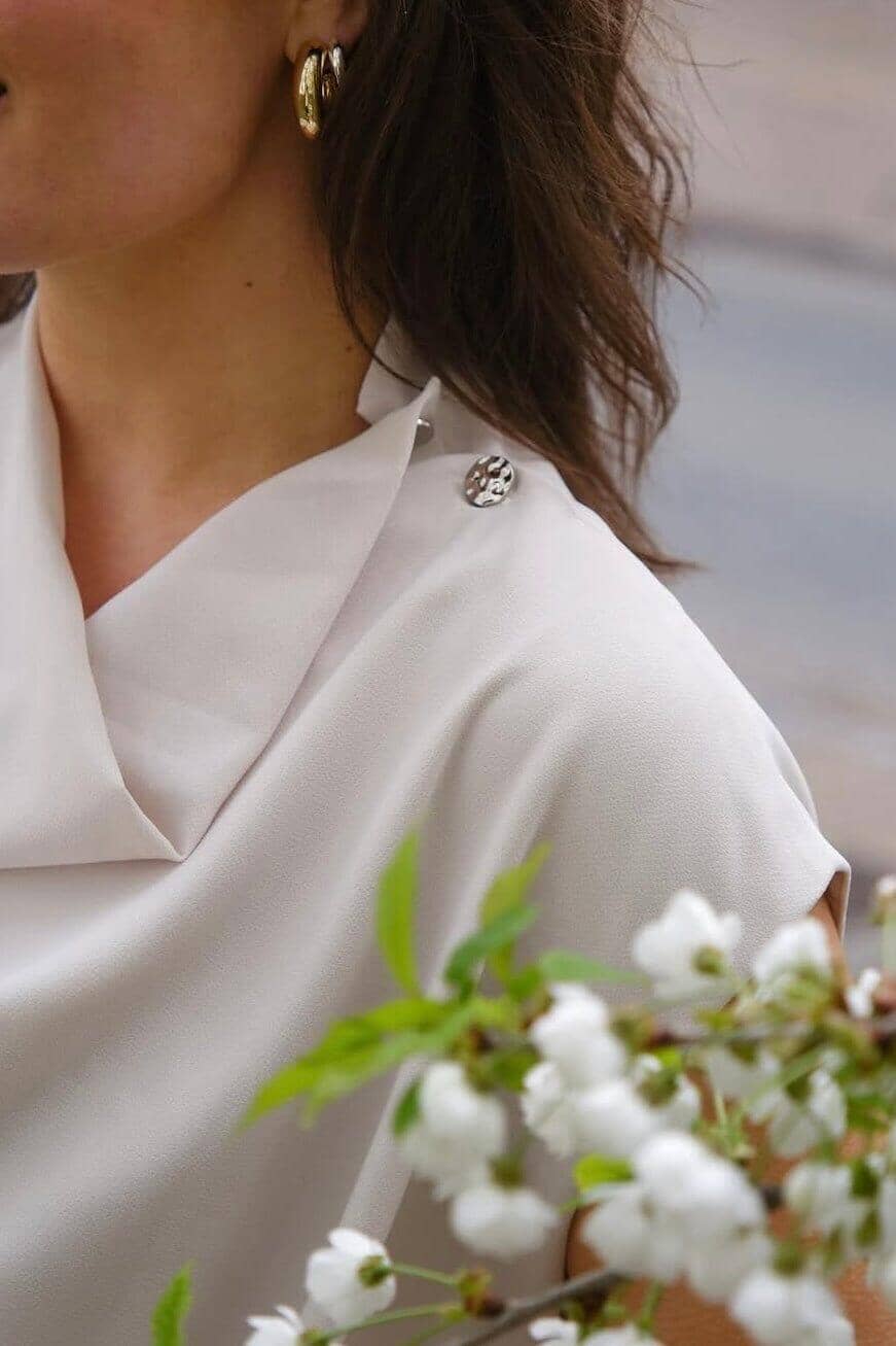 Blouse van Neo Noir in ivory met cowl-halslijn. Het heeft een losse pasvorm en decoratieve knopen op de schouder die het een uniek karakter geven.