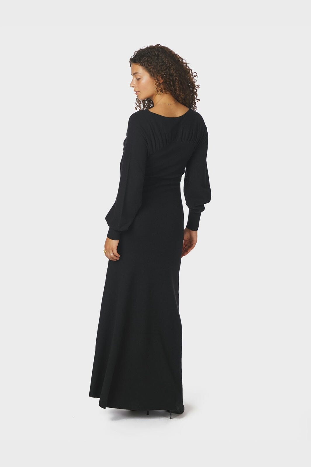 Zwarte gebreide jurk van Neo Noir met een gerimpeld detail bij de halslijn. De jurk heeft brede mouwen en een lichte wijdte aan de onderkant, wat zorgt voor veel bewegingsvrijheid.