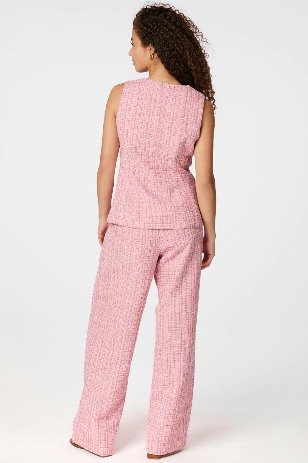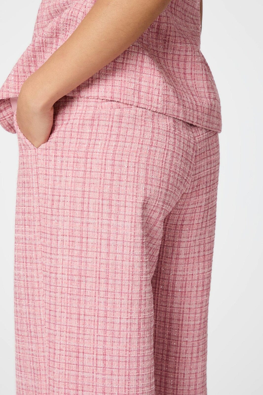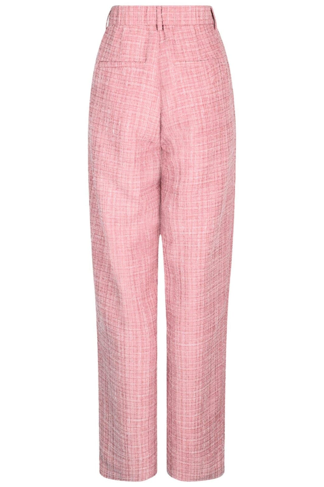Roze broeken van Neo Noir in boucle-kwaliteit. De broeken hebben een hoge taille en wijde benen met een losse pasvorm. Ze zijn ontworpen met knopen en een geruit patroon.