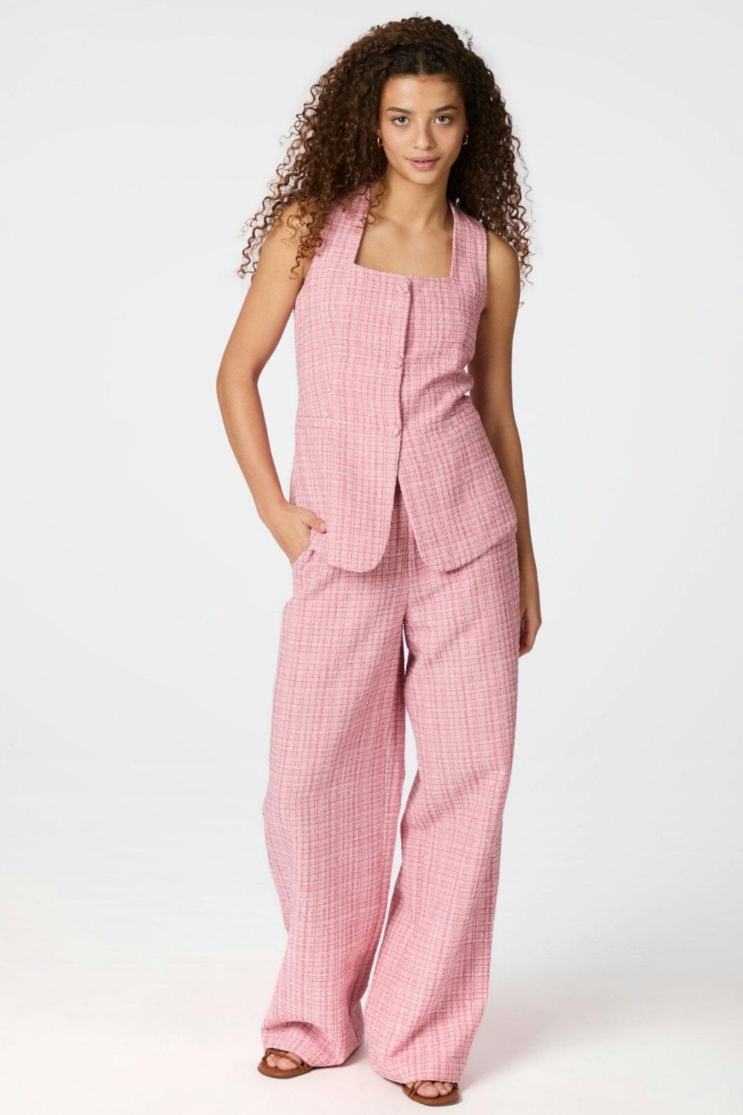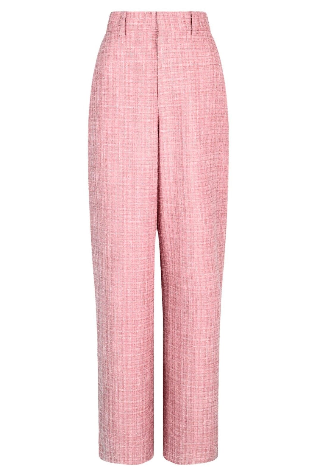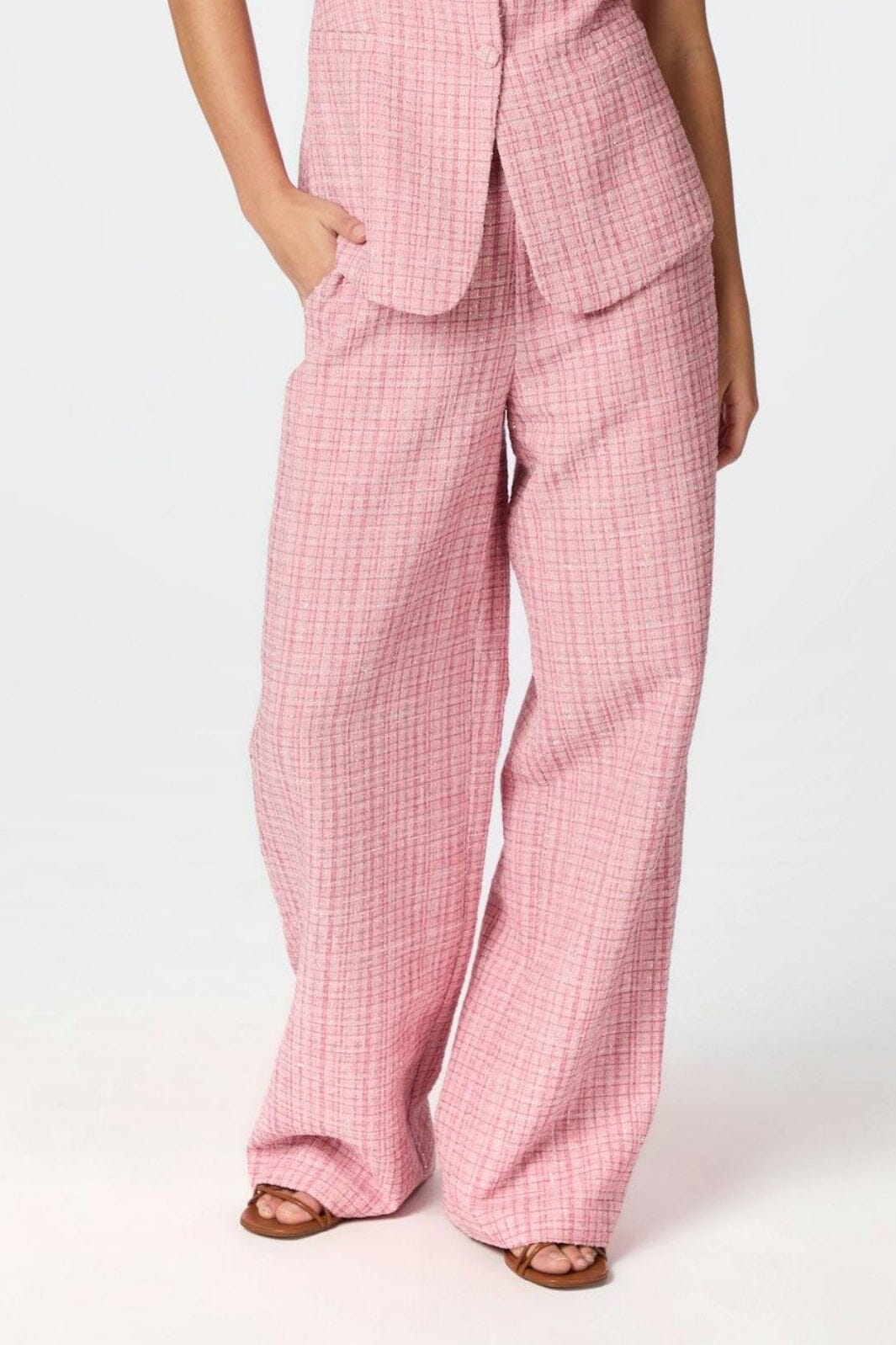Roze broeken van Neo Noir in boucle-kwaliteit. De broeken hebben een hoge taille en wijde benen met een losse pasvorm. Ze zijn ontworpen met knopen en een geruit patroon.