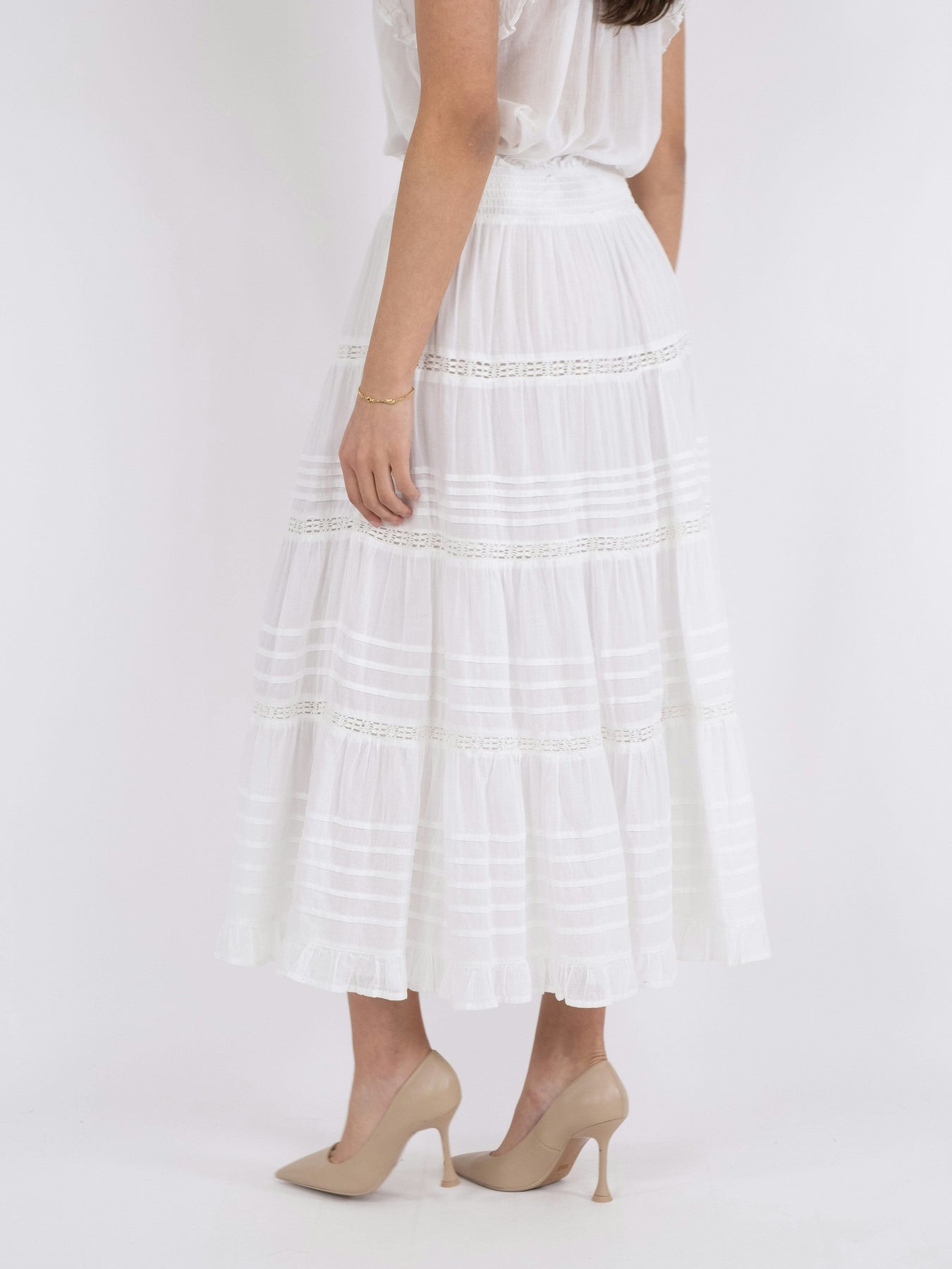 Witte voile rok met een gelaagd ontwerp en horizontale strepen. De rok heeft ruches en decoratieve stiksels die een lichte en luchtige uitstraling geven.
