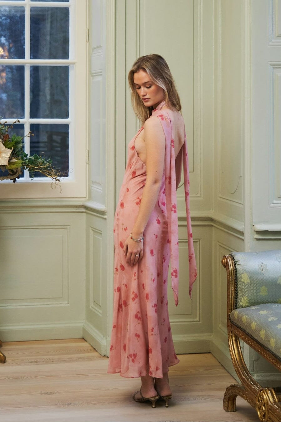 Lange halterjurk van Neo Noir in roze met een bloemenprint. De jurk heeft een open rug en een lange strikband in de nek.