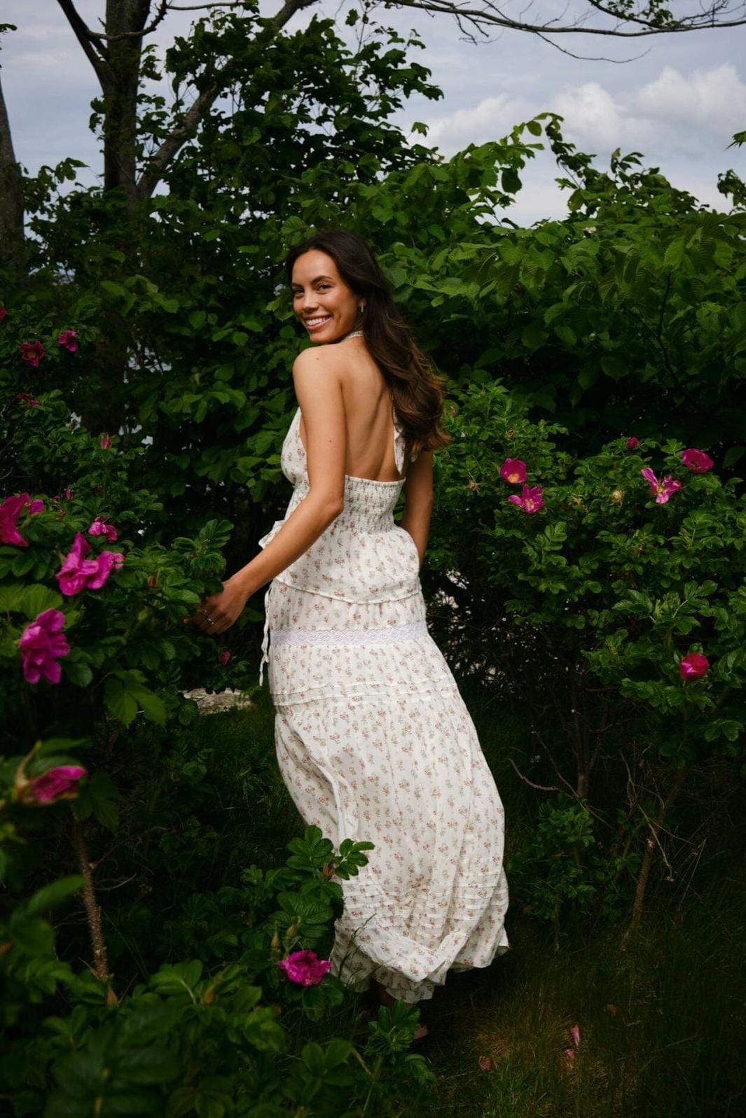 Lange rok van Neo Noir in crème met kleine roze bloemen. De rok heeft ruches en plooien die beweging in de stof creëren, evenals een elastische taille met een strikband.