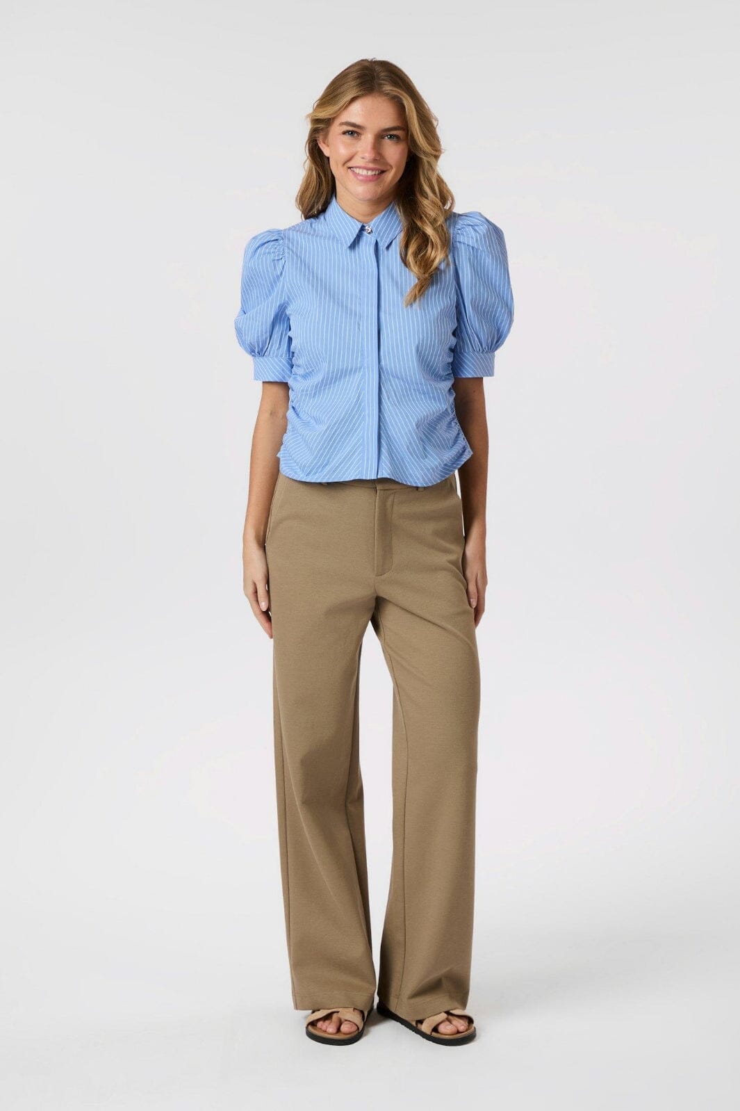 Gestreepte blouse van Neo Noir in lichtblauw. Het heeft pofmouwen en een overhemdkraag met decoratieve knoop. De blouse heeft een slim fit met strepen.