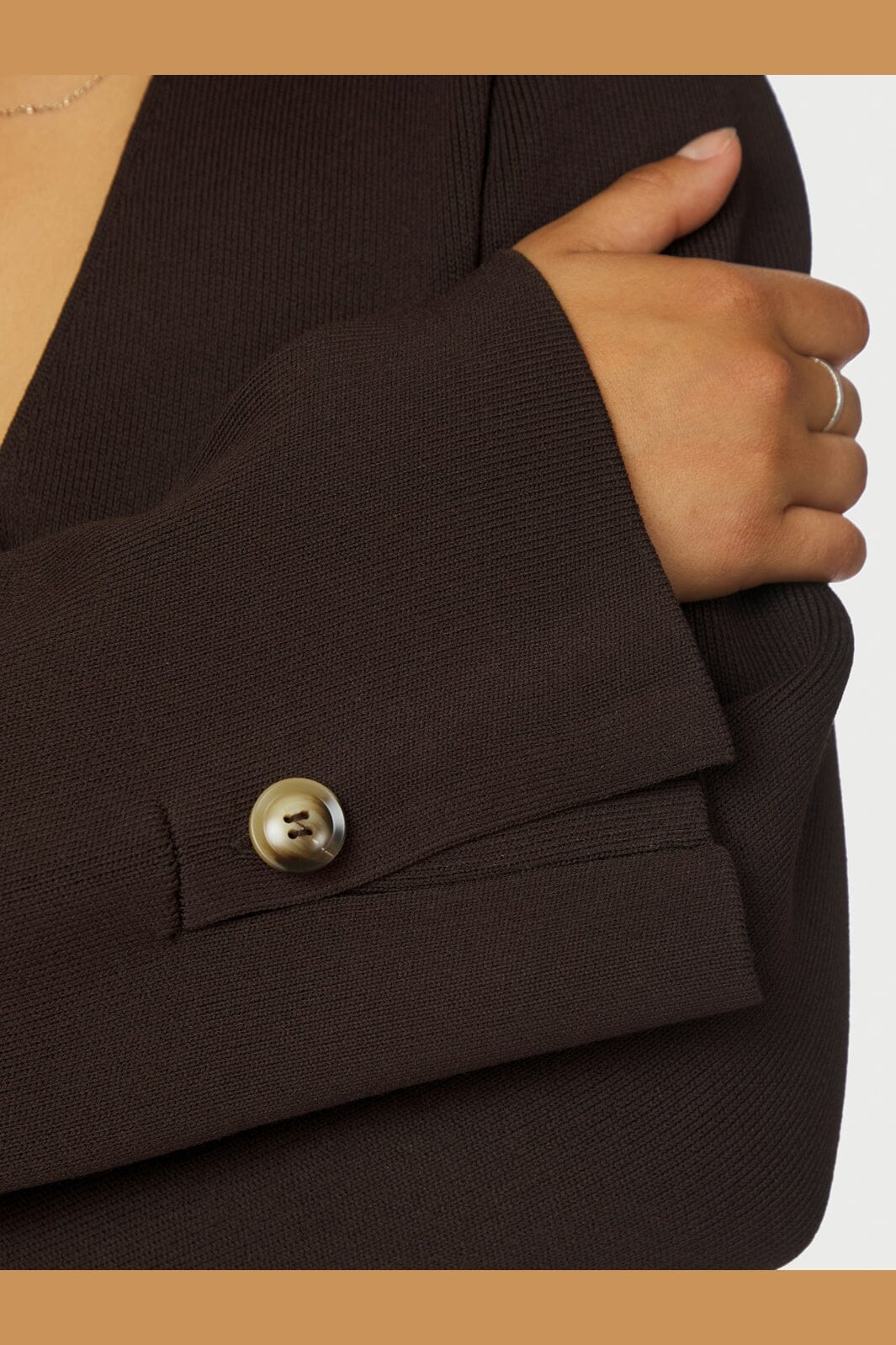 Donkerbruine gebreide trui van Neo Noir met een V-hals en hoornknopen. De trui heeft een aansluitende pasvorm en lange mouwen met knopen bij de manchetten.