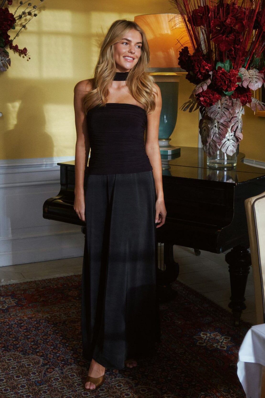 Zwarte lange jurk van Neo Noir met een hoge hals en plooidetails aan de bovenkant. De jurk heeft een nauwsluitend bovenstuk en een losse rok, die ruimte biedt voor beweging.