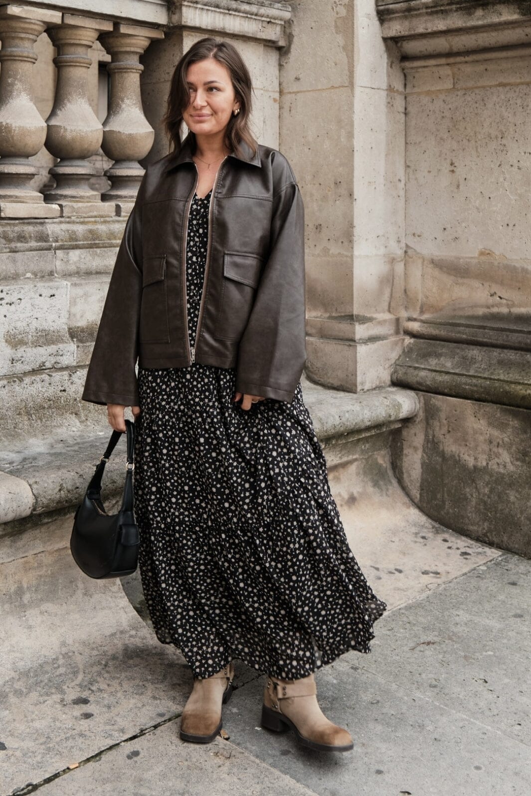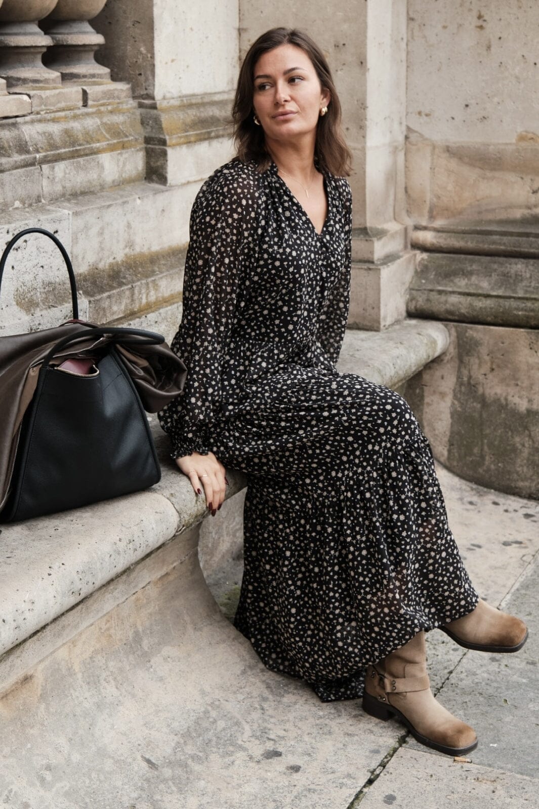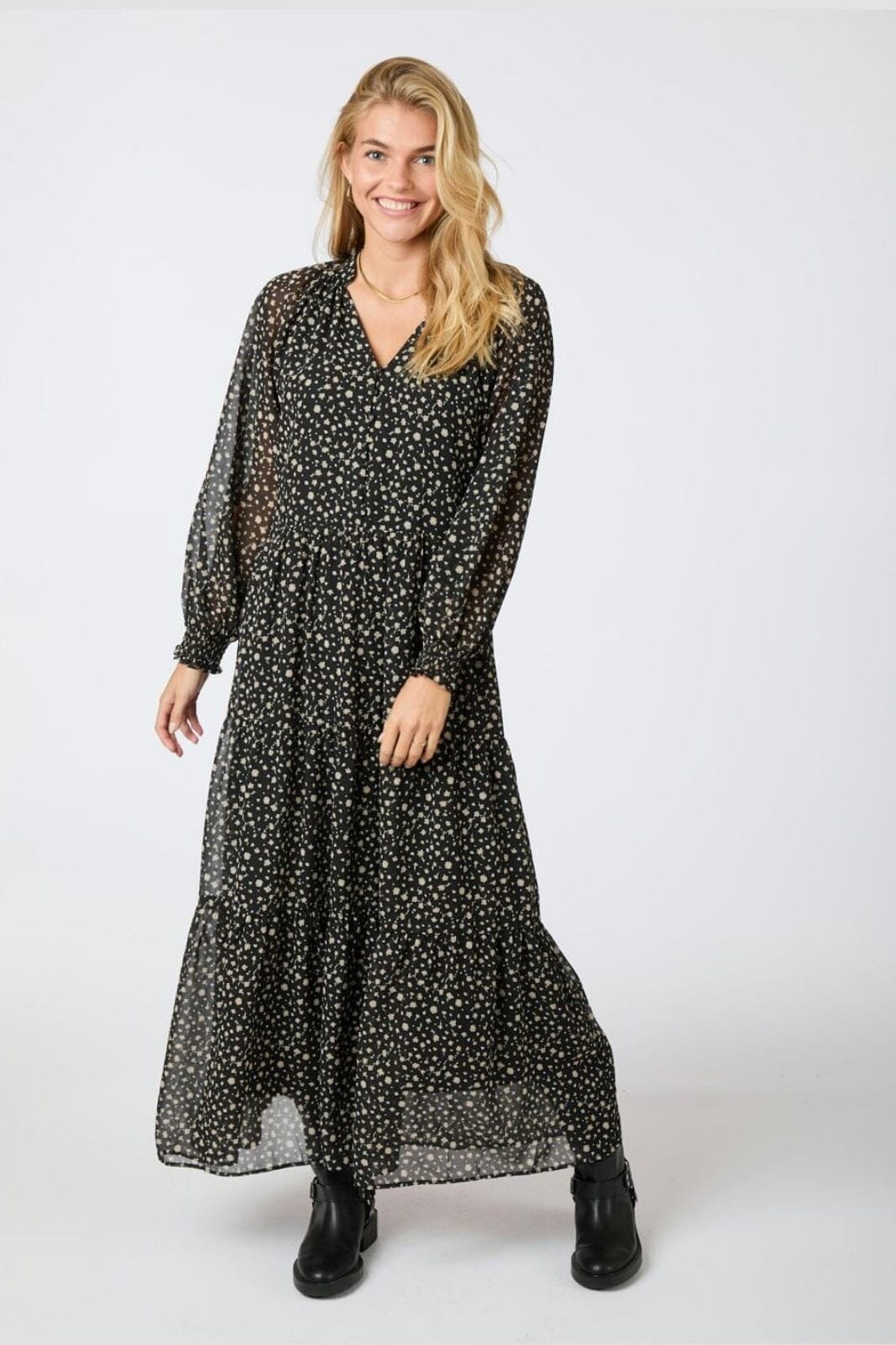 Zwarte enkellange jurk van Neo Noir met witte en beige bloemen. De jurk heeft een v-hals, lange mouwen en ruchesdetails.