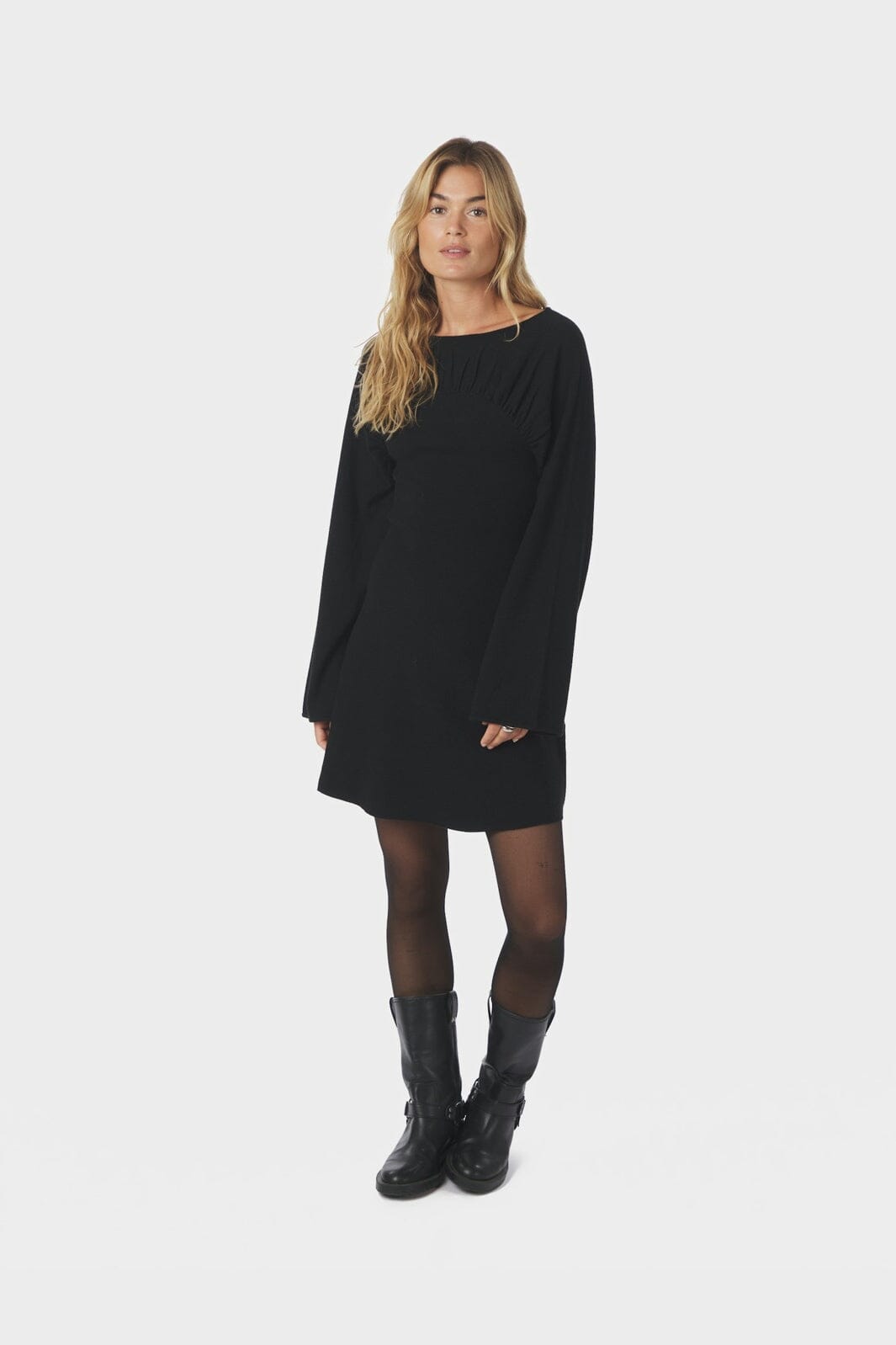 Zwarte gebreide jurk van Neo Noir met een ronde halslijn. De jurk heeft een nauwsluitend bovenstuk met plooidetails op de borst en rug, dat overgaat in een licht gevormde rok.