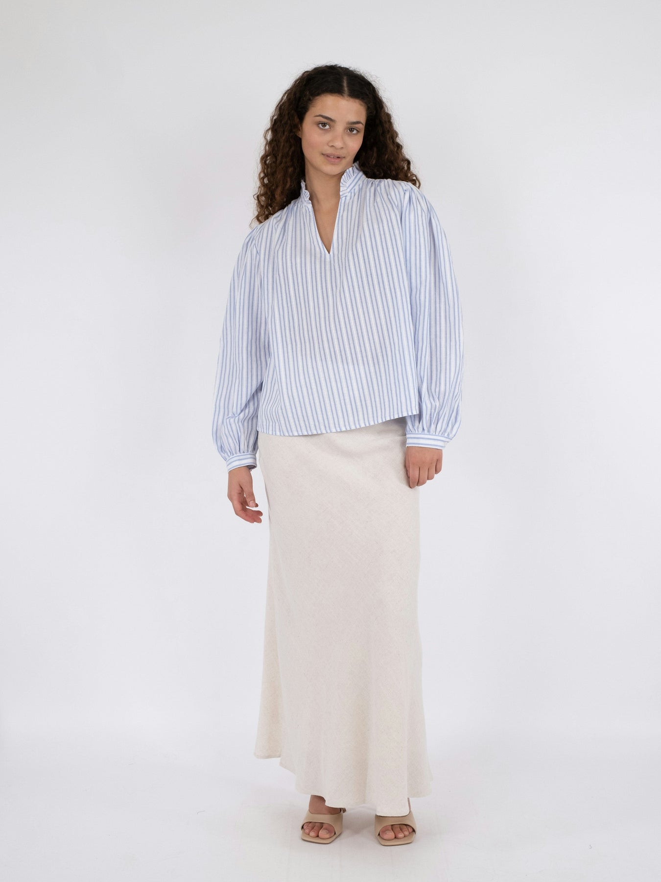 Gestreepte blouse van Neo Noir in lichtblauw en wit. De blouse heeft pofmouwen en een v-hals met ruches. De losse pasvorm biedt veel bewegingsvrijheid.