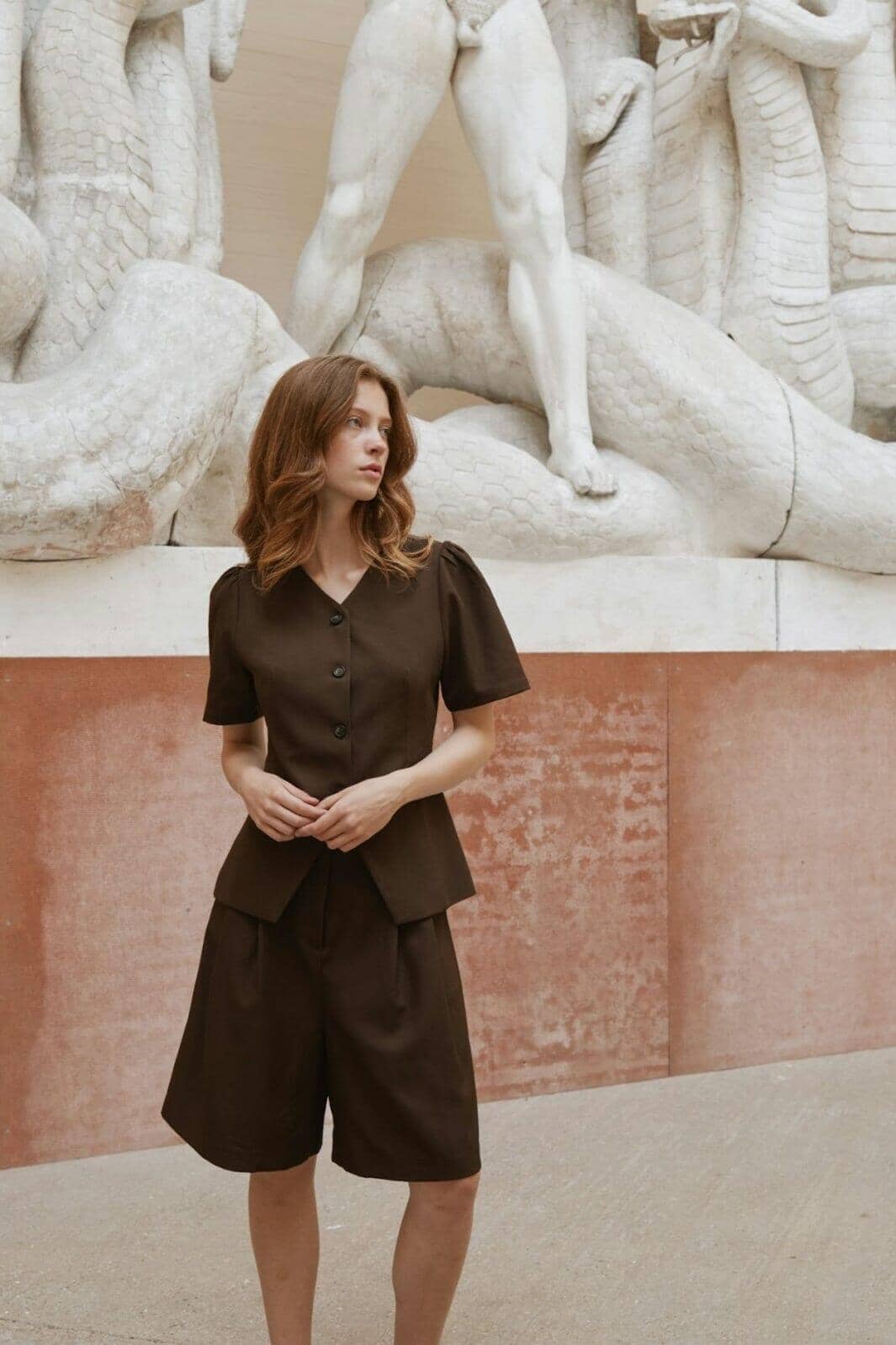 Donkerbruine blouse van Neo Noir met een slim fit pasvorm. De blouse heeft een V-hals en korte pofmouwen met zichtbare naaddetails. De knoopsluiting aan de voorkant maakt het makkelijk om aan en uit te trekken.