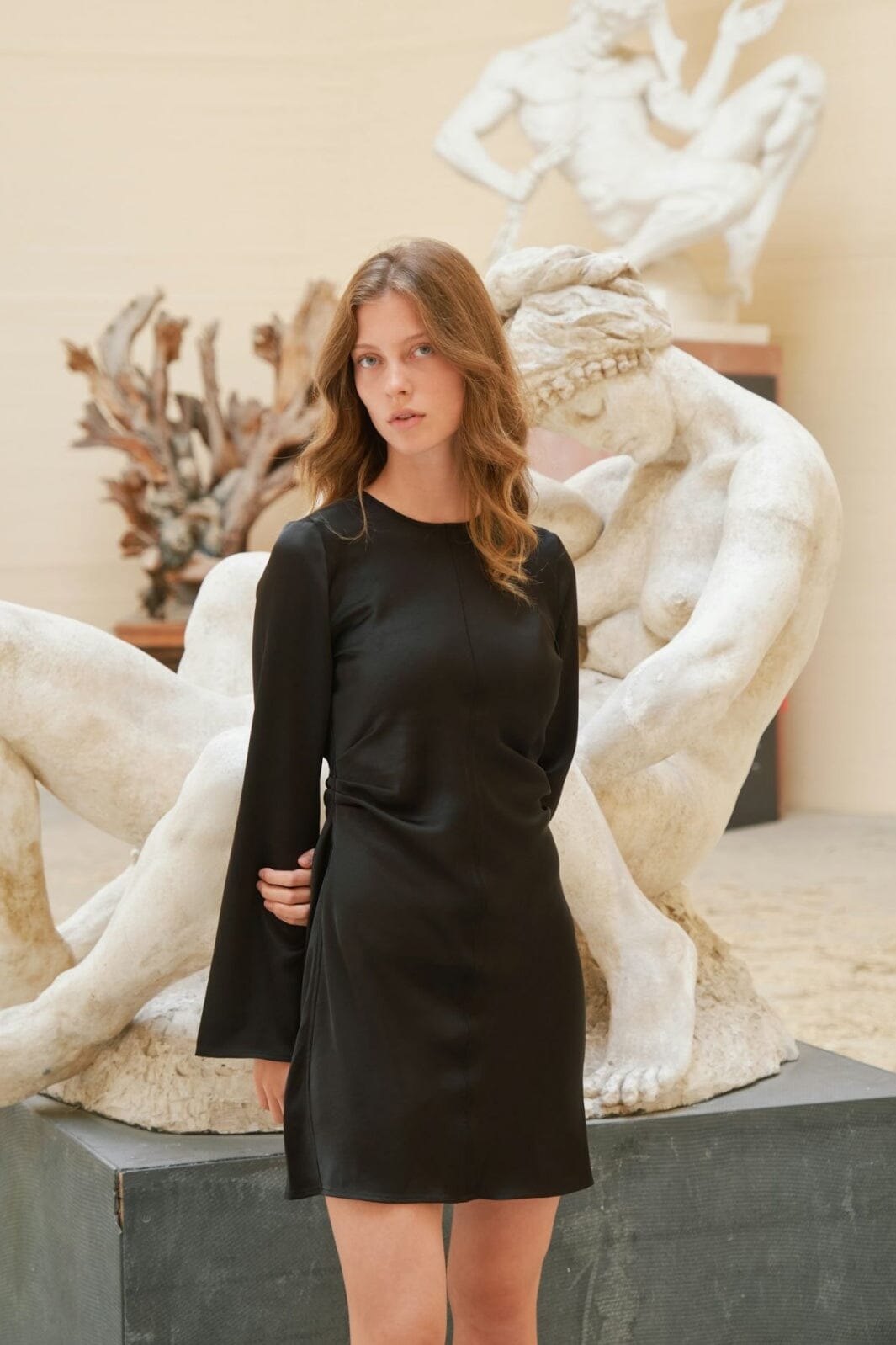 Zwarte satijnen jurk met een aansluitende pasvorm en lange mouwen. De jurk heeft ruches en wijde mouwen. Een rits aan de achterkant maakt het gemakkelijk om aan en uit te trekken.