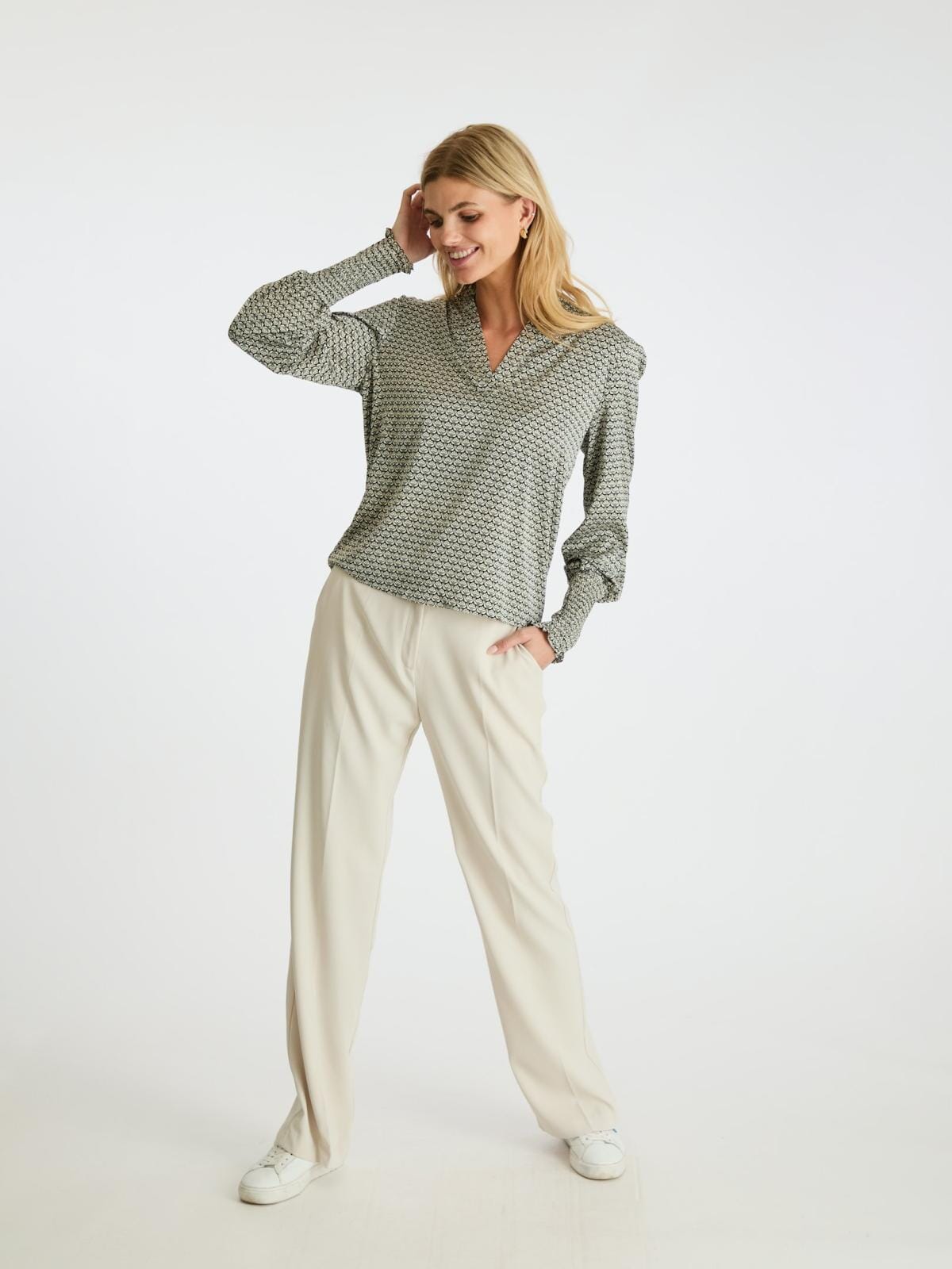 Zwarte blouse van Neo Noir met grafisch patroon. De blouse heeft lange mouwen met smockmanchetten en een open V-hals. De grafische print in zwart en wit geeft een schone en moderne uitstraling.