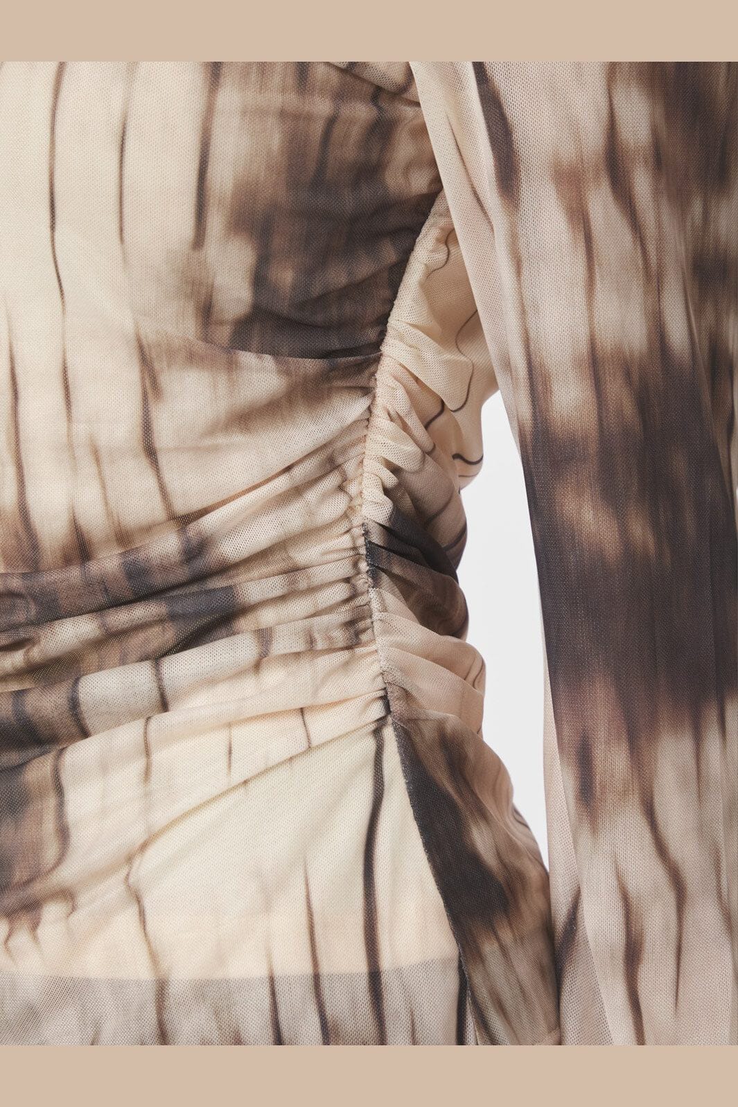 Meshblouse van Neo Noir in een bruine tint met een vervaagd printje. De blouse heeft plooidetails bij de taille en lange wijde mouwen.