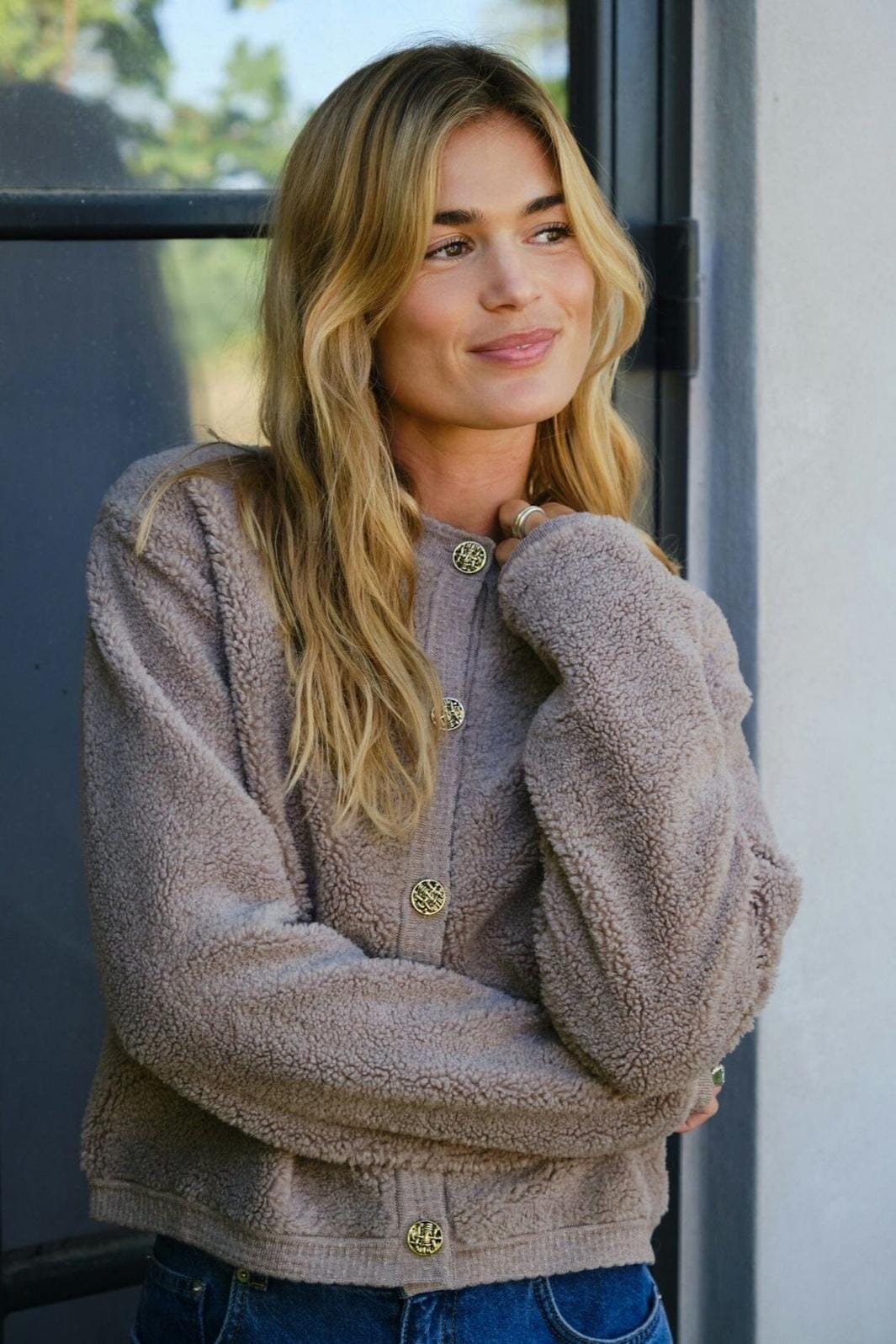 Korte gebreide cardigan in een zachte kwaliteit met 2 zakken, sluit met decoratieve knopen aan de voorkant.