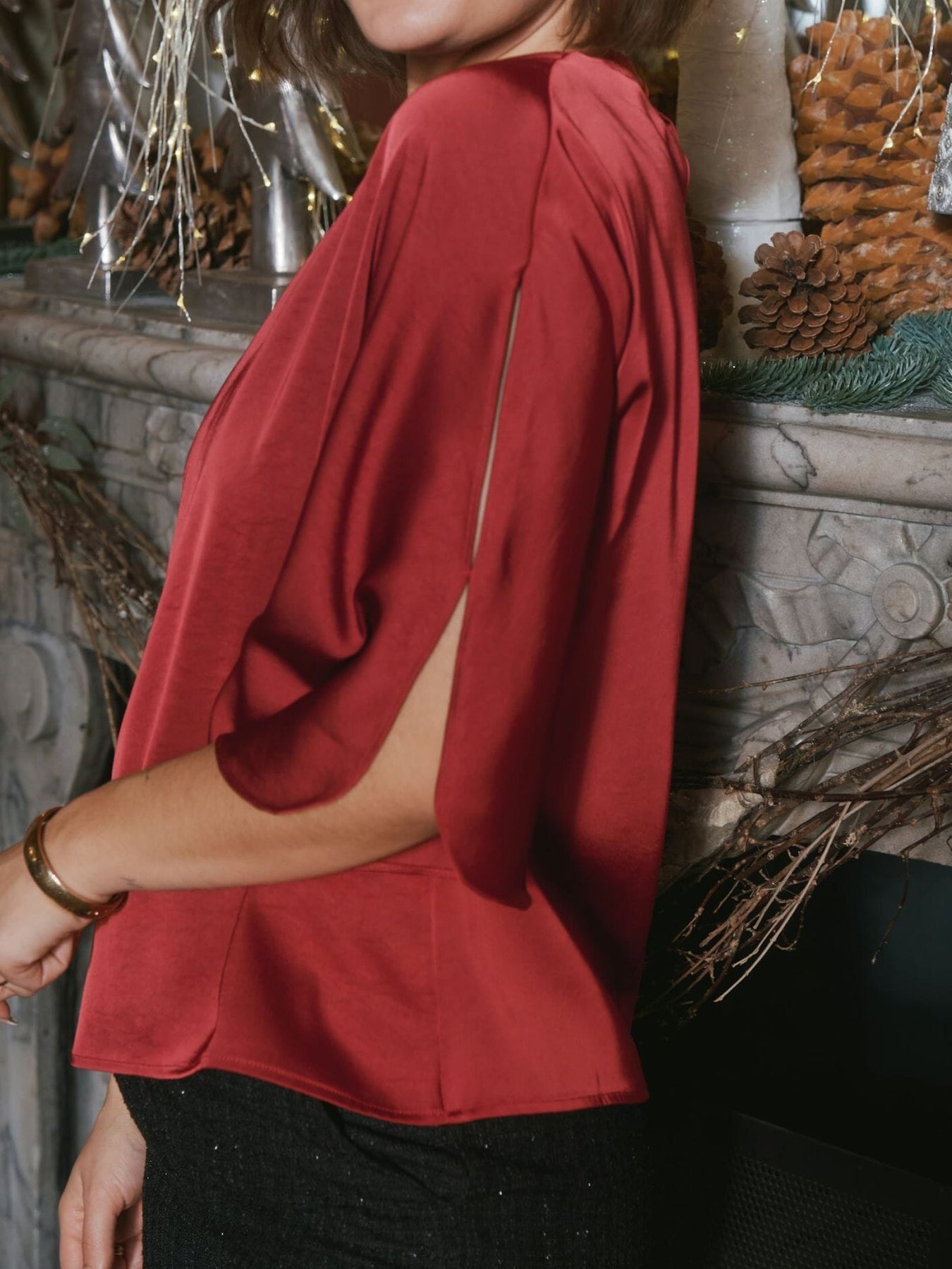 Donkerrode blouse van Neo Noir in satijnkwaliteit. De blouse heeft een ronde halslijn en driekwart mouwen met een split. Een knoopsluiting aan de achterkant maakt het gemakkelijk om aan en uit te trekken.