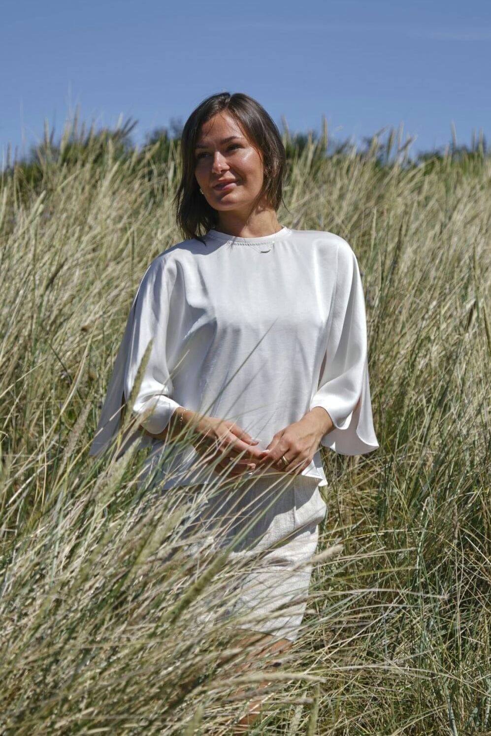 Satinblouse van Neo Noir in een lichte parel kleur. De blouse heeft brede mouwen met splitten en een ronde halslijn met sleutelhole detail in de nek.