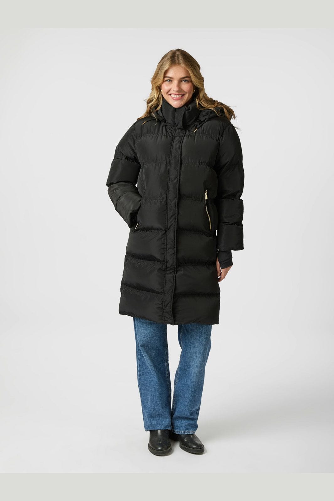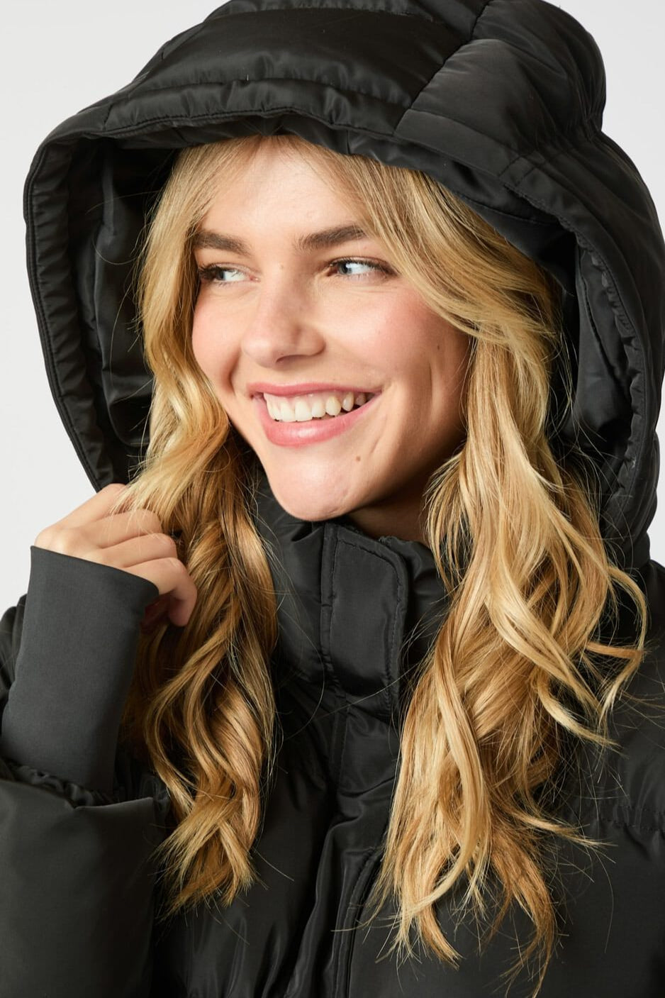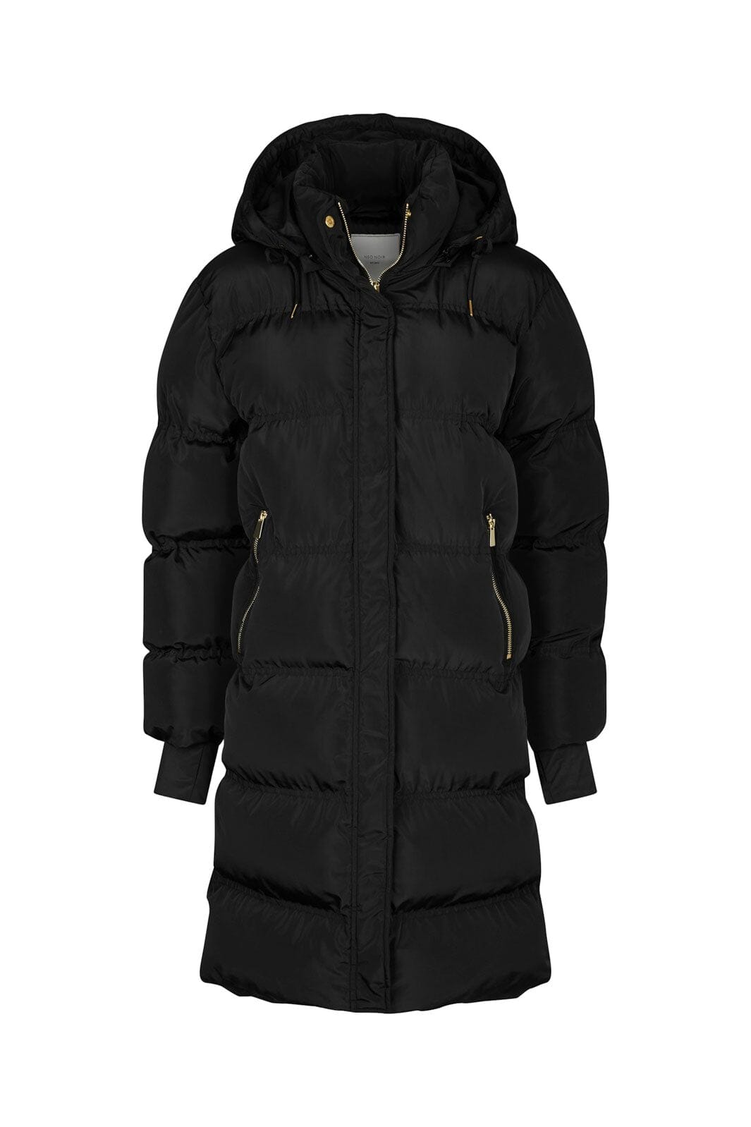Gewatteerde jas, semi-lang en heeft een afneembare capuchon. De details zijn vrouwelijk in de vorm van goudkleurig metaal. Het model is 176 cm en draagt maat 36.