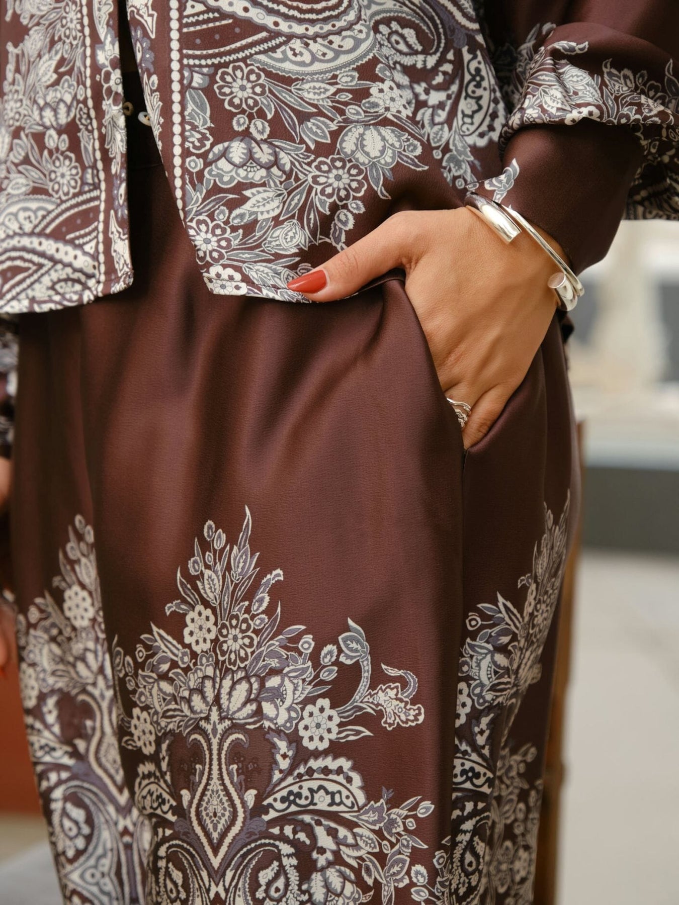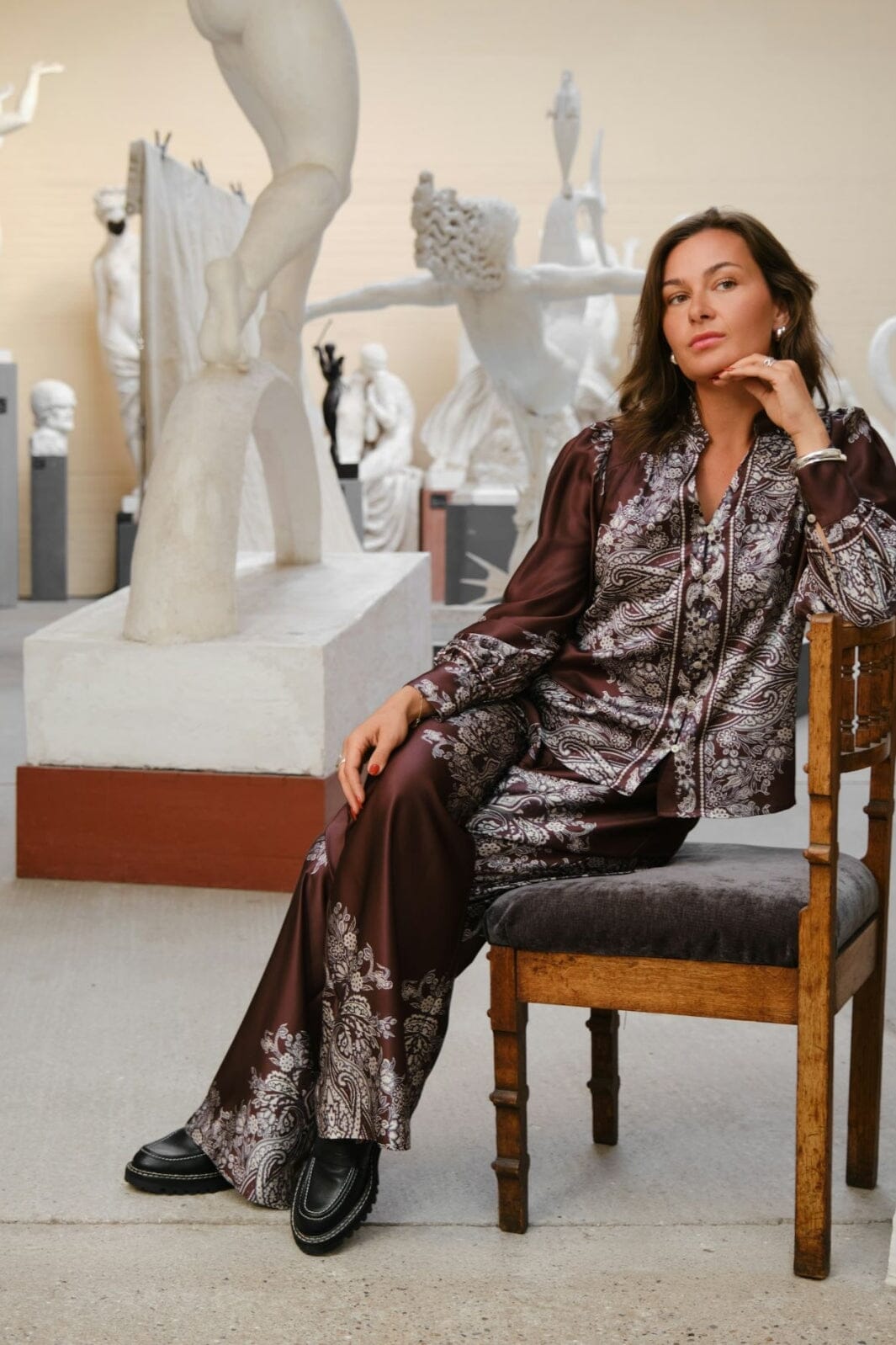 Donkerbruine broek van Neo Noir in satijn met paisley-patroon. De broek heeft wijde pijpen en reikt tot de grond, met elastiek in de taille voor gemakkelijk aan- en uittrekken.