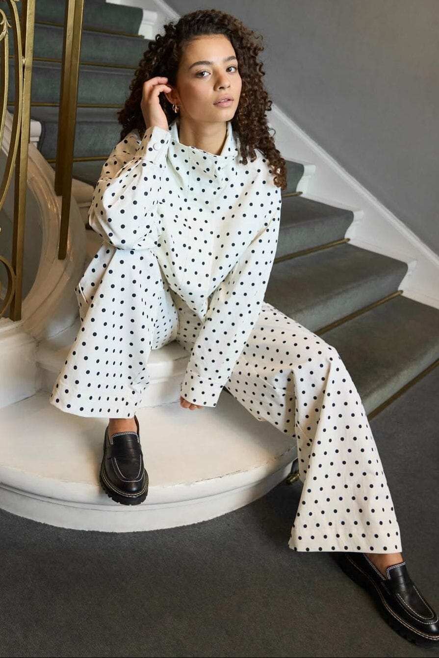 Witte broek van Neo Noir met zwarte stippen. De broek heeft een hoge taille en een vloerlang model met een losse pasvorm en wijde pijpen.