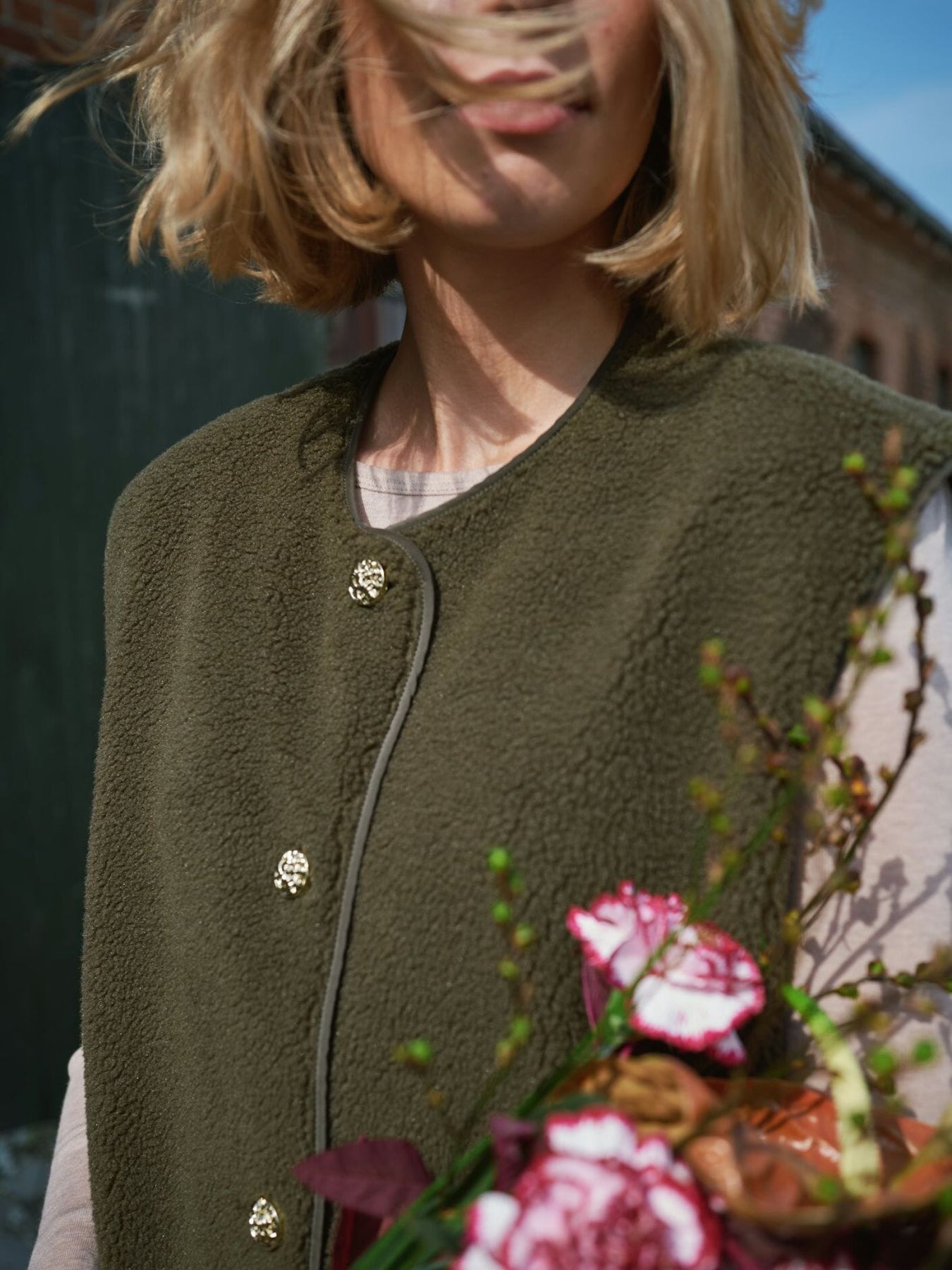 Teddyvest van Neo Noir in legergroen met zachte stof. De vest heeft een losse pasvorm en sluit met vier gouden knopen aan de voorkant. De ronde halslijn geeft een eenvoudige uitstraling.