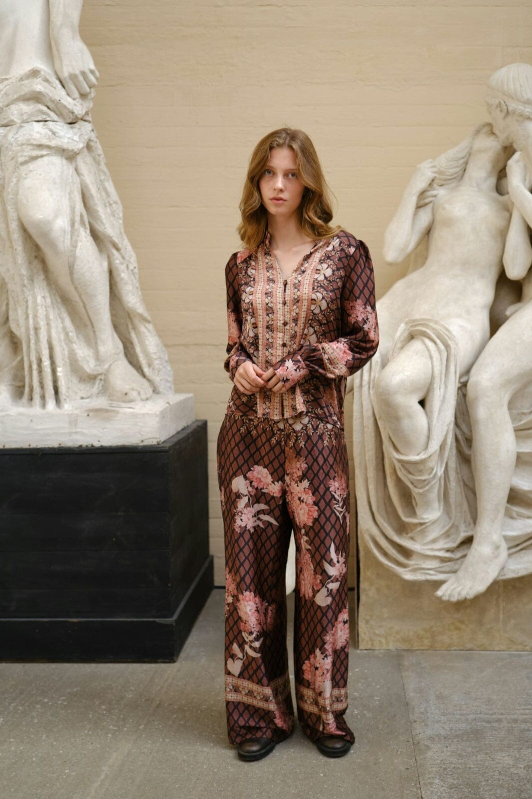 Zwarte blouse van Neo Noir met bloemenprint in roze en aardetinten. De blouse heeft een V-hals met knoopsluiting aan de voorkant en lange mouwen met ruches.