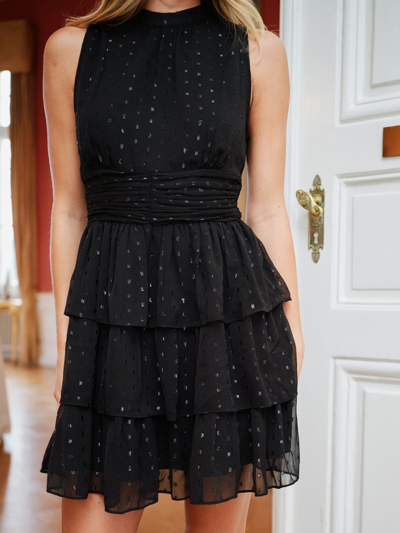 Zwarte feestjurk van Neo Noir met een stippenpatroon. De jurk heeft een hoge hals met strik en meerdere lagen in de korte rok. De stof heeft een lichte glittereffect die het licht vangt.