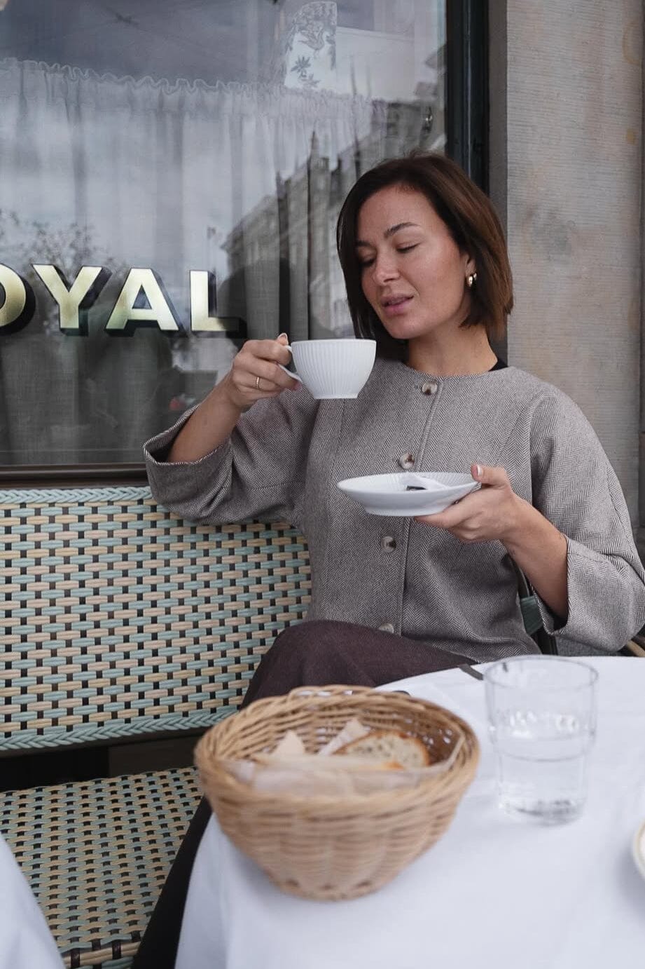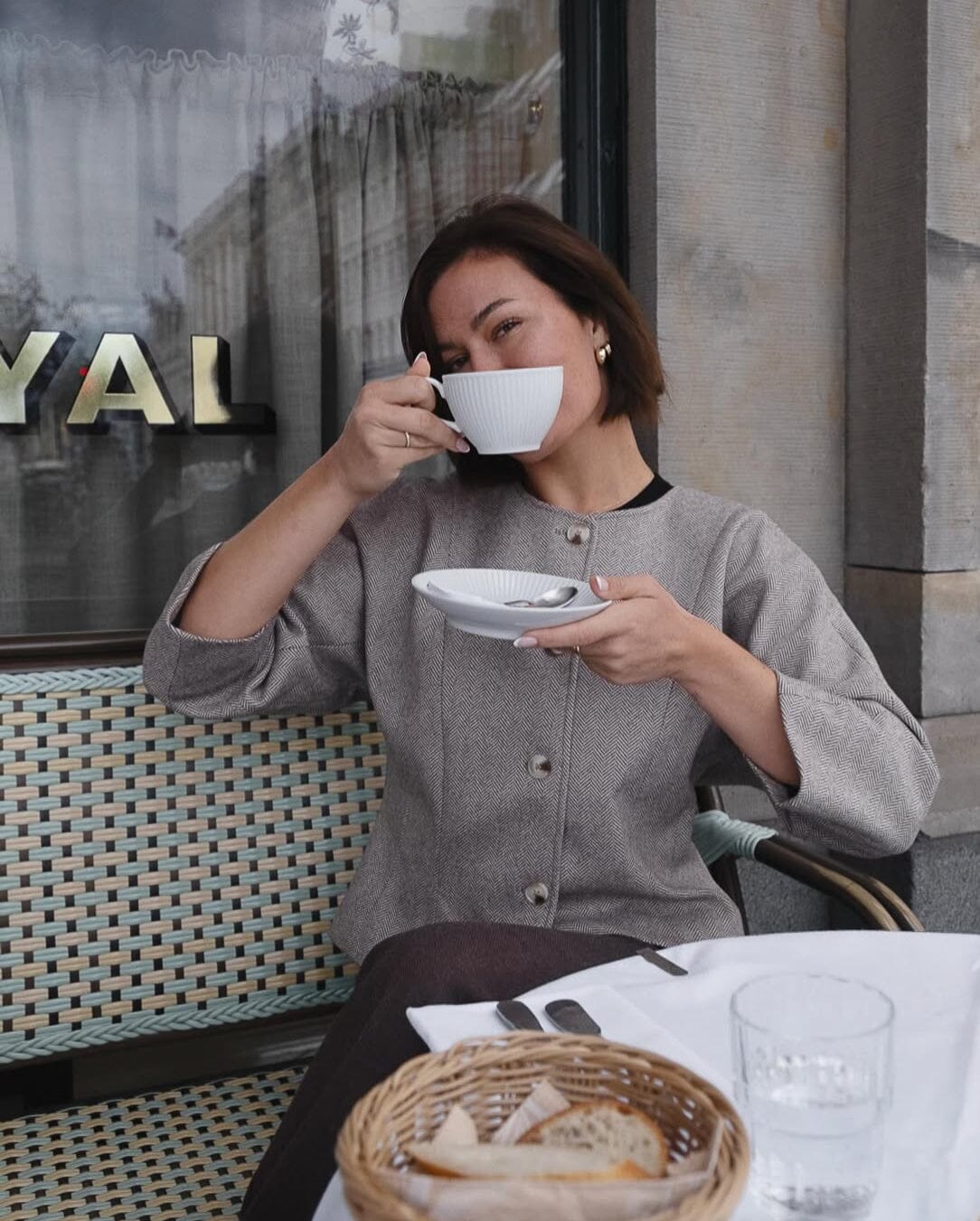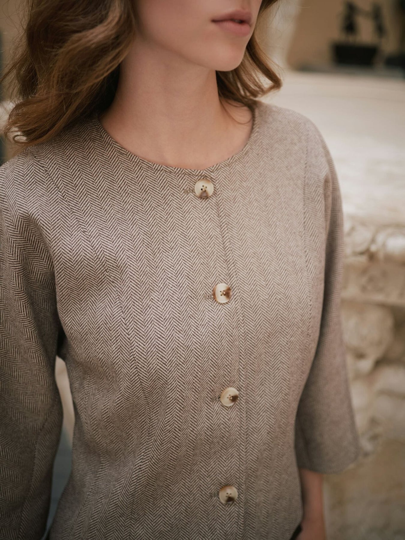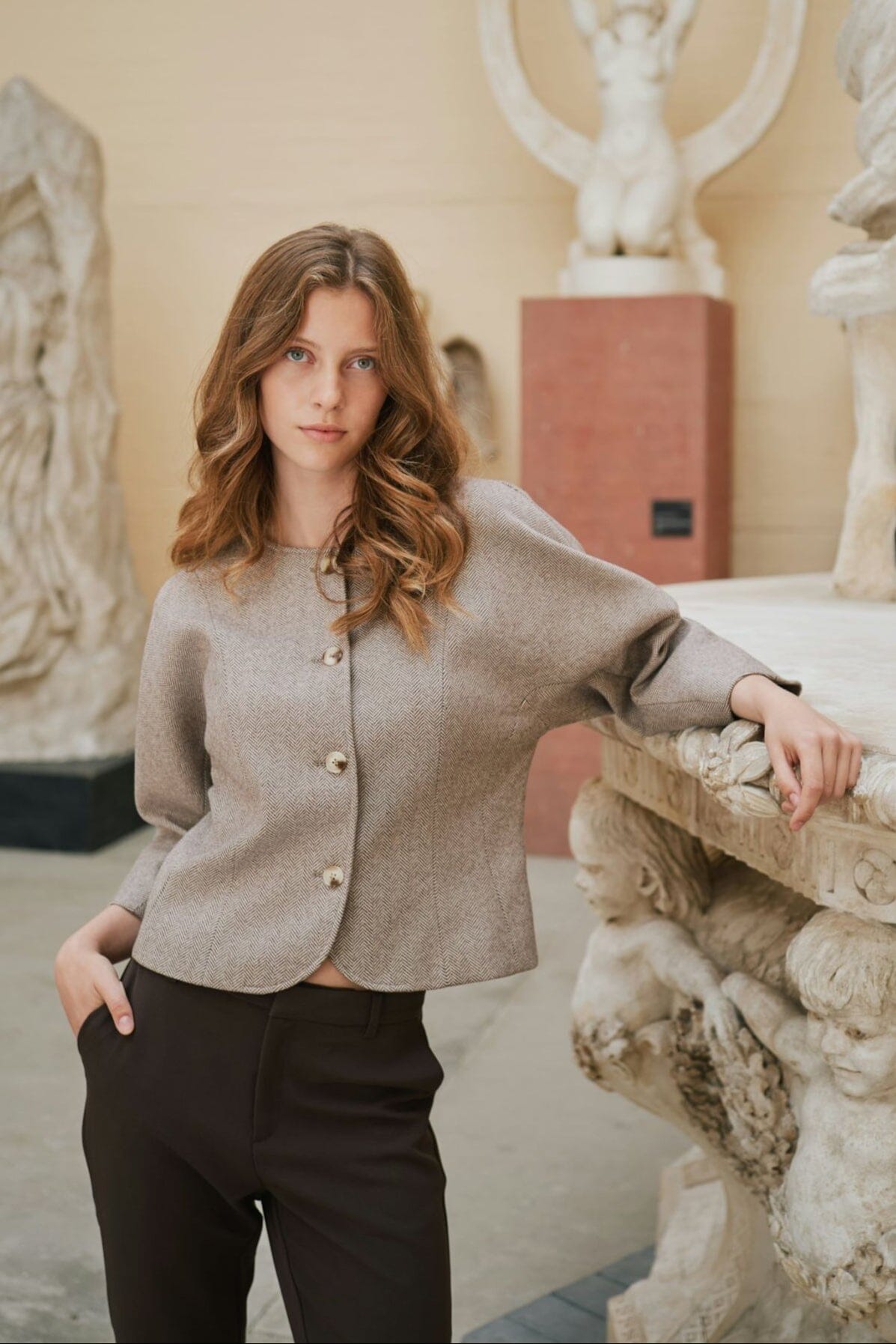 Mooie jas met gebogen mouwen en afgeronde details in een fijne visgraat kwaliteit. Het model is 176 cm lang en draagt maat 36.