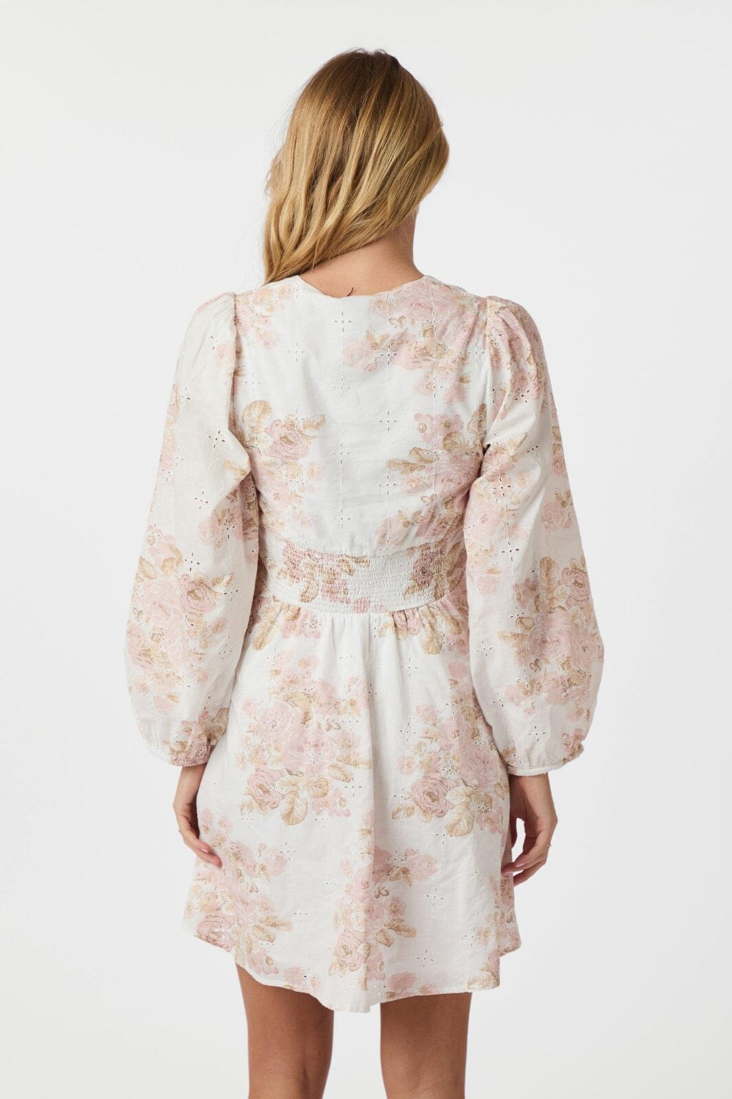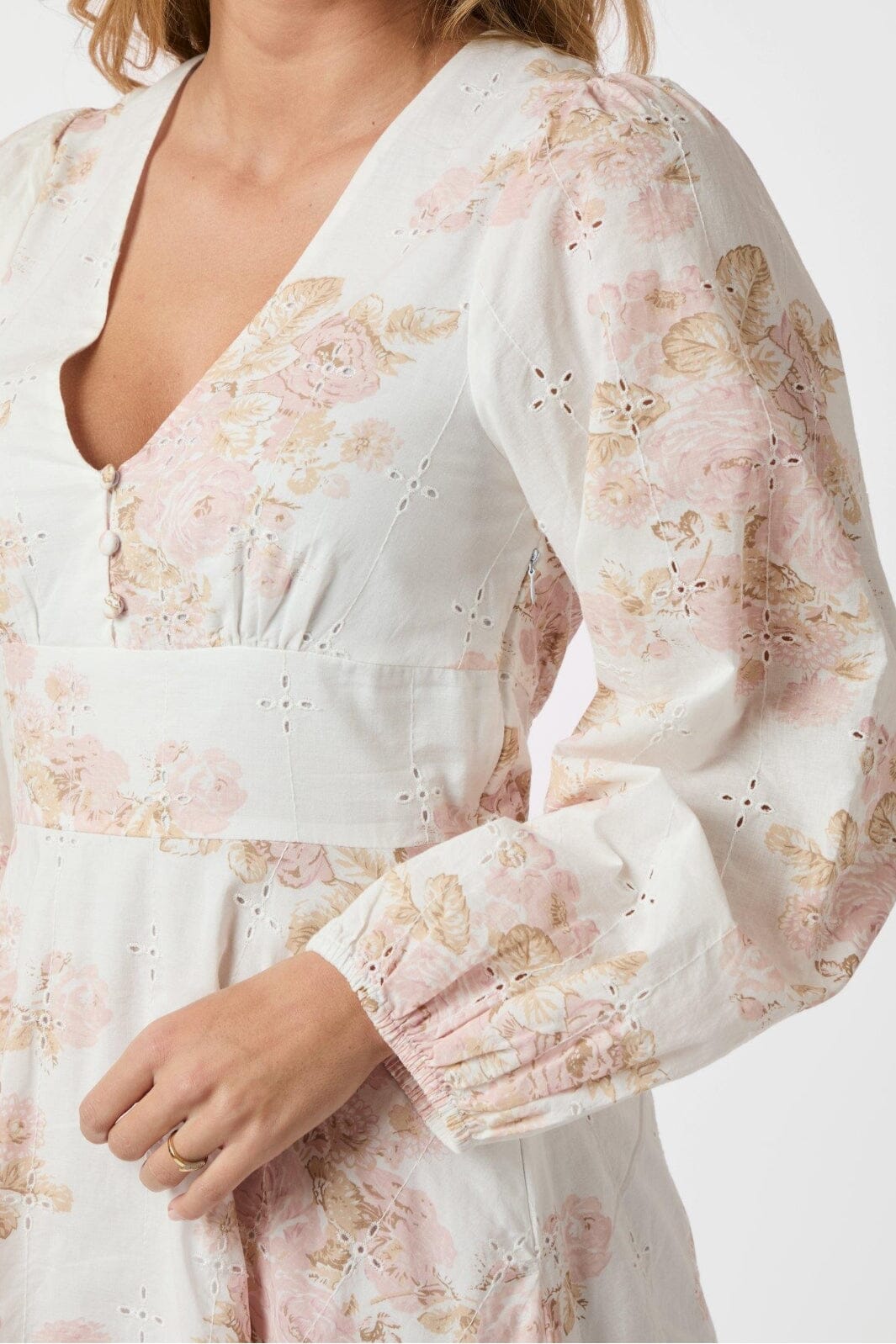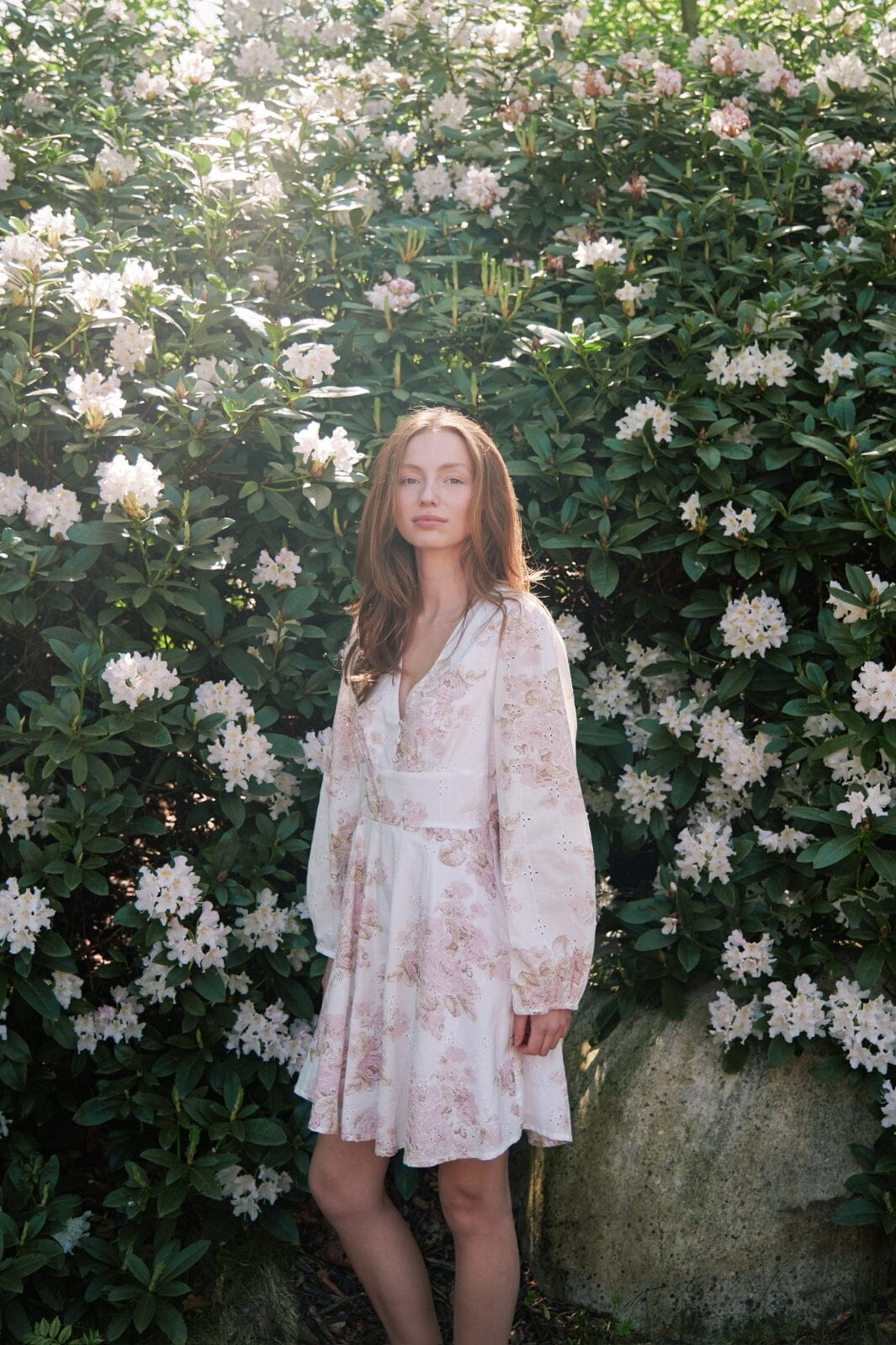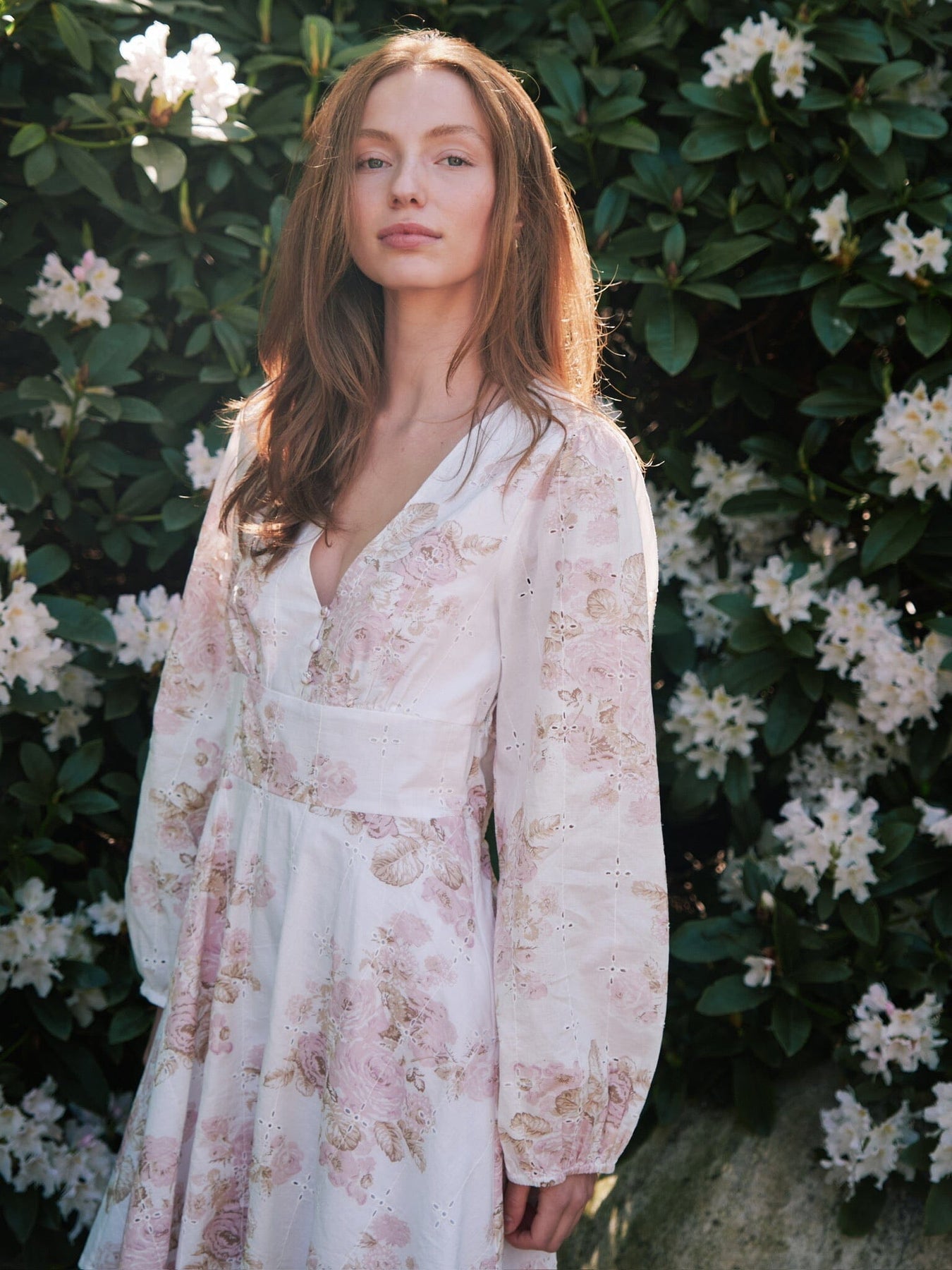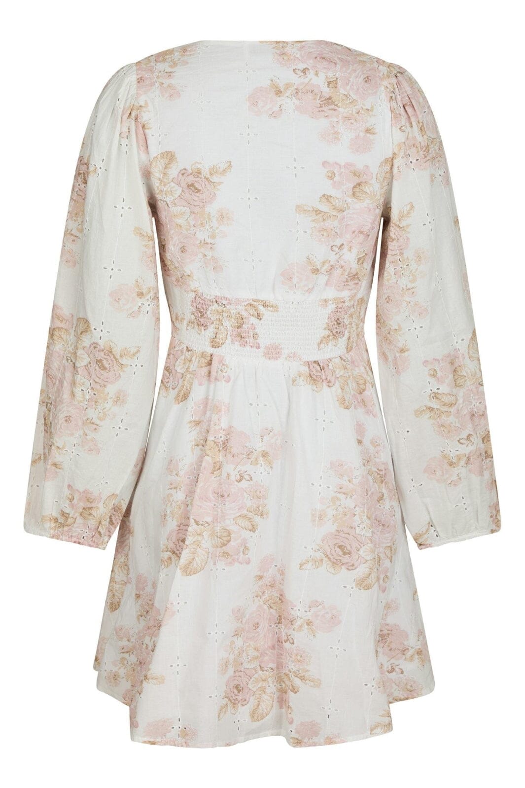 Gebloemde jurk van Neo Noir in stoffig roze met geborduurde details. De jurk heeft een v-hals en lange pofmouwen. Het lichte ontwerp met een losse pasvorm biedt veel bewegingsvrijheid.