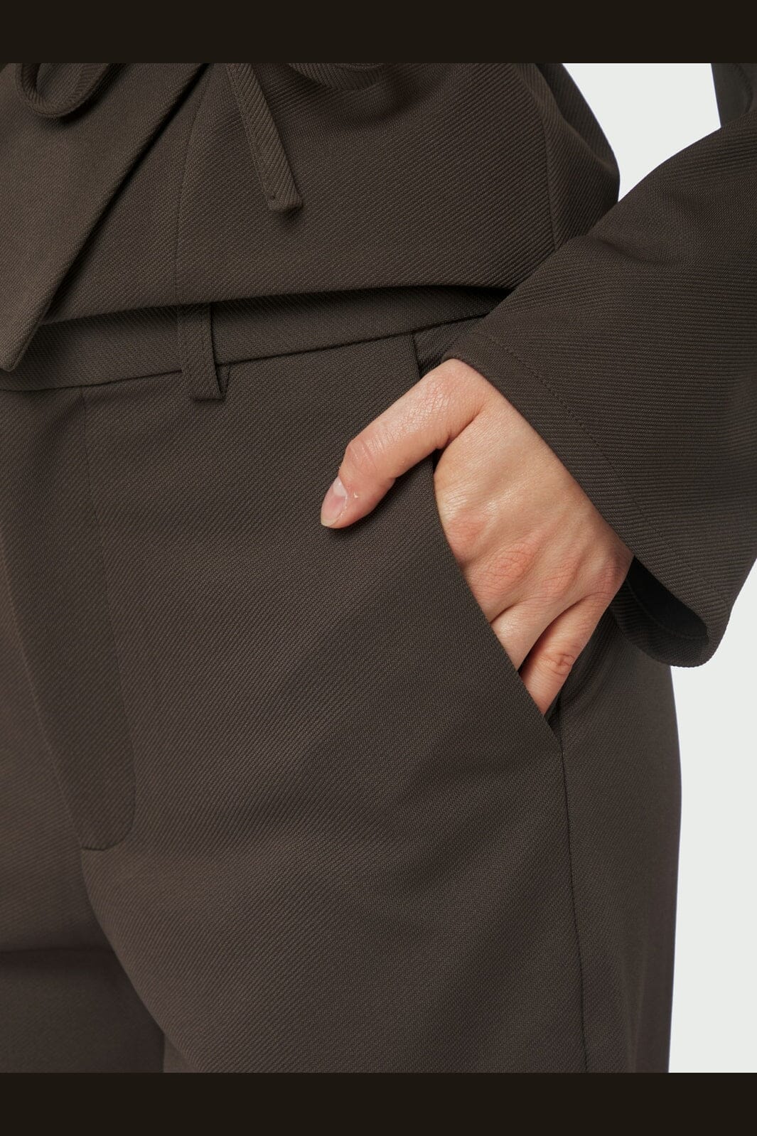 Donkerbruine broek van Neo Noir met een hoge taille en een losse pasvorm. De broek heeft rechte pijpen en riemlussen, en ze komen helemaal tot op de grond.