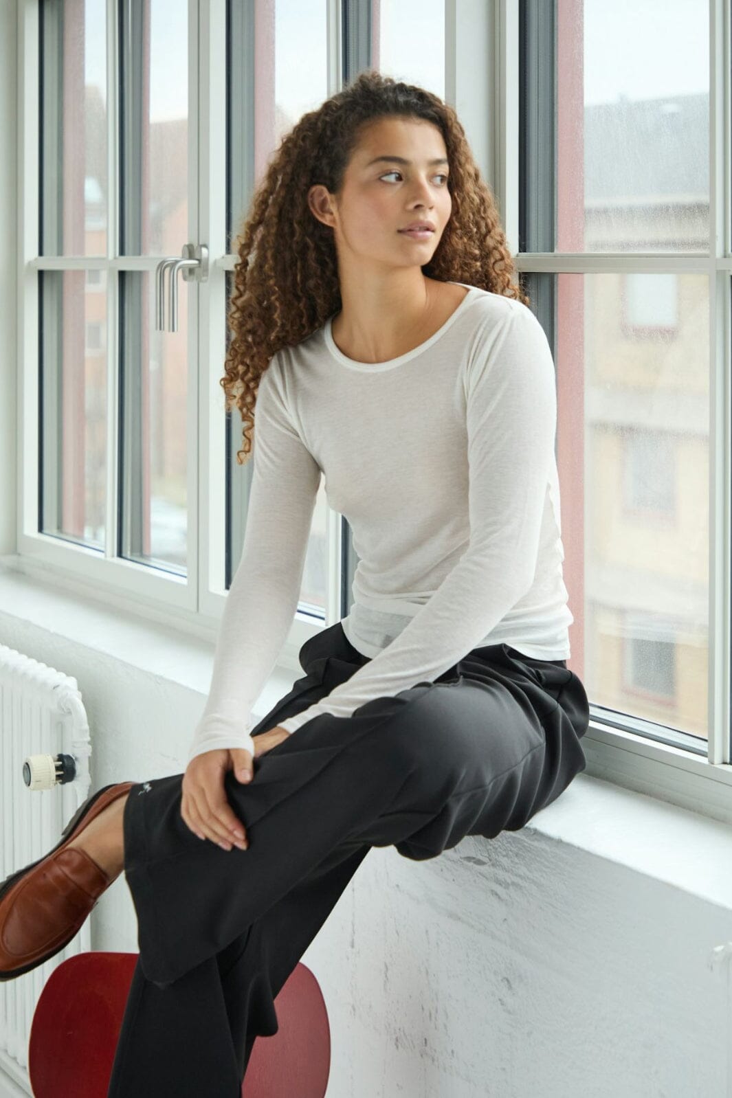 Witte ribtop van Neo Noir met ronde hals en lange mouwen. De top heeft een aansluitende pasvorm en is gemaakt van een zachte en lichte ribgebreide kwaliteit.