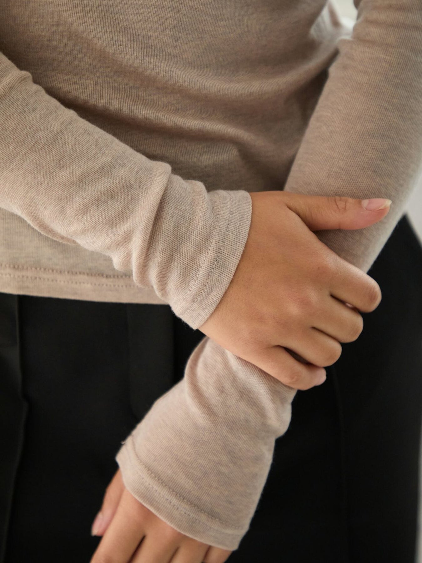 Beige melange-blouse van Neo Noir in ribgebreid materiaal. Een nauwsluitende blouse met ronde hals en lange mouwen in een neutrale kleur die bij veel andere kleuren past.