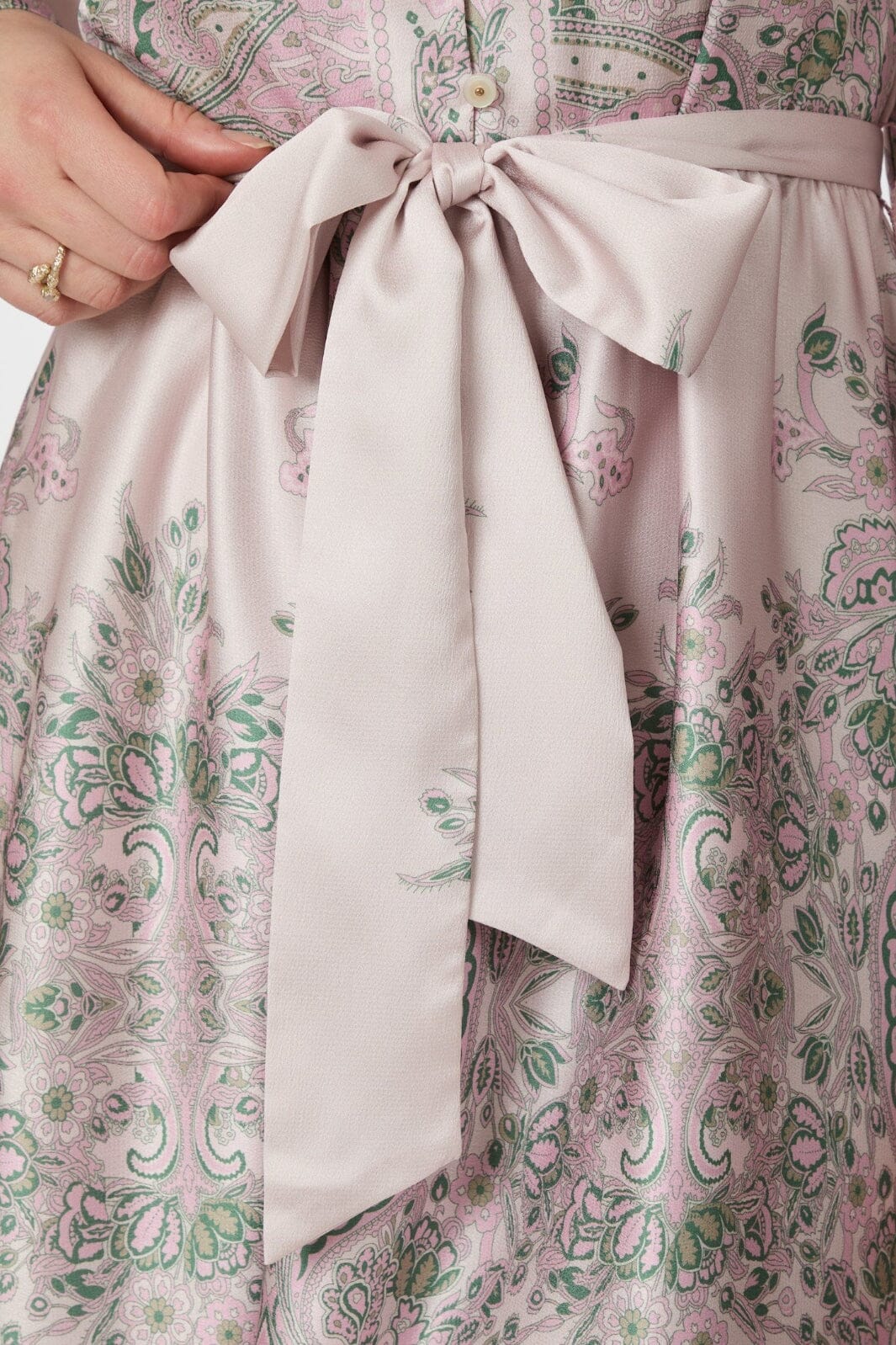 Enkellange jurk van Neo Noir in roze met paisley-print. De jurk heeft een overhemdkraag, lange mouwen en knopen helemaal naar beneden. Een strikband in de taille en ruches geven de jurk karakter.