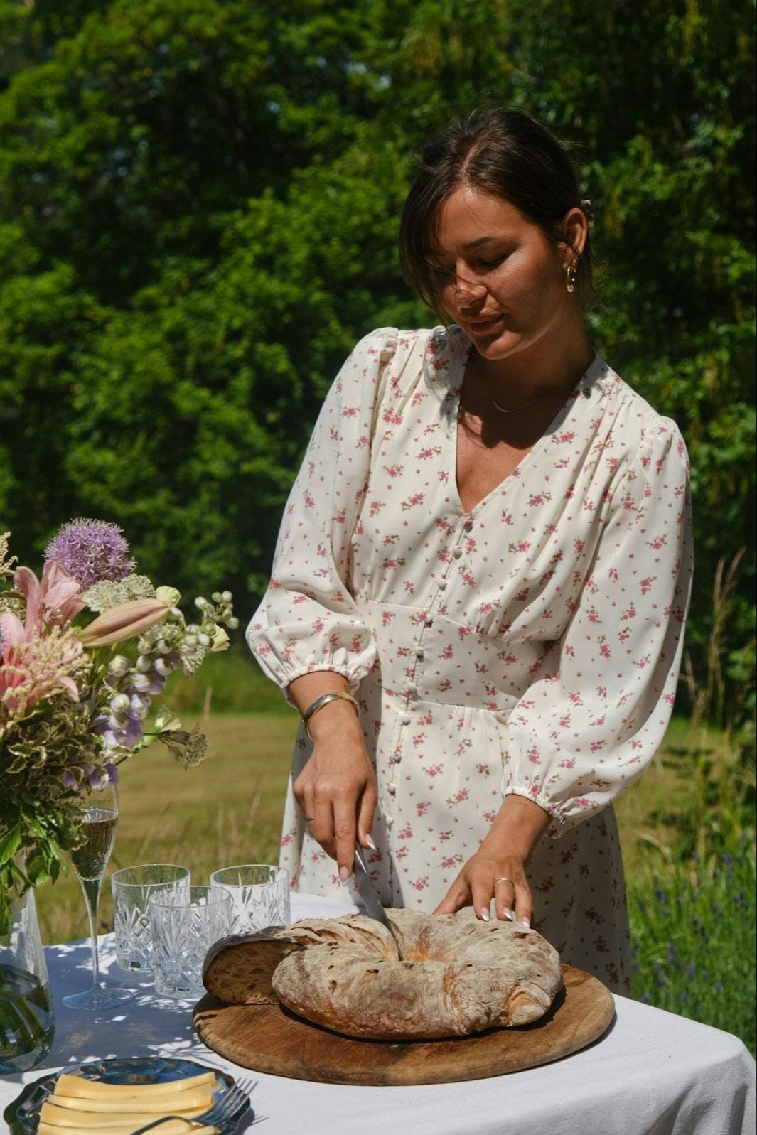 Bloemenjurk van Neo Noir met roze bloemen op een lichte achtergrond. De jurk heeft een V-hals, 3/4 pofmouwen en knopen aan de voorkant.
